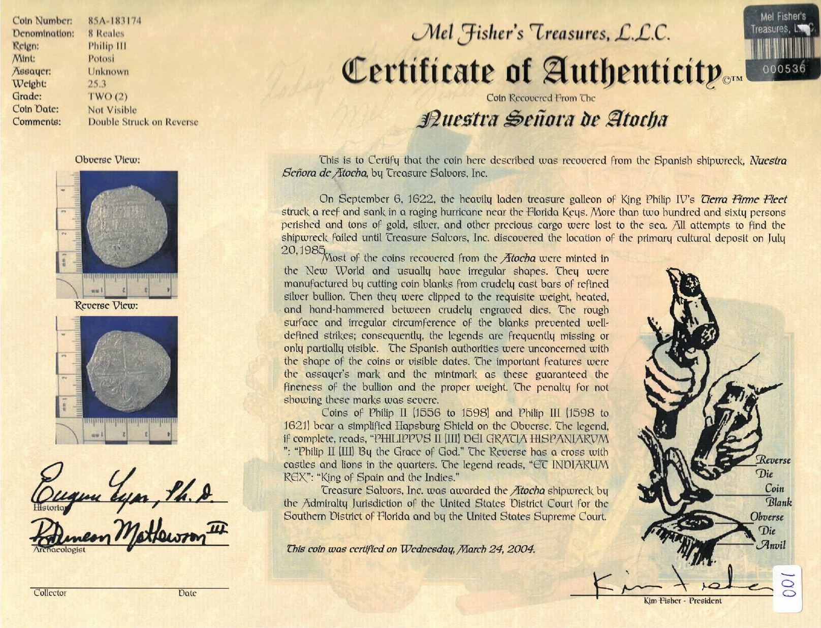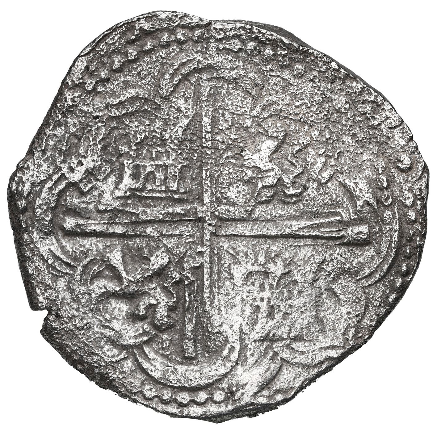 Potosi, Bolivia, cob 8 reales, Philip II, assayer B (4th period), Grade 2. S-P12; KM-5.1. 25.45 grams. Well-detailed full shield and cross despite moderate surface corrosion, faintly visible assayer (not mentioned on certificate), distinctive lions. With Fisher tag and photo-certificate 85A-183174. From: Atocha, sunk in 1622 west of Key West, Florida
