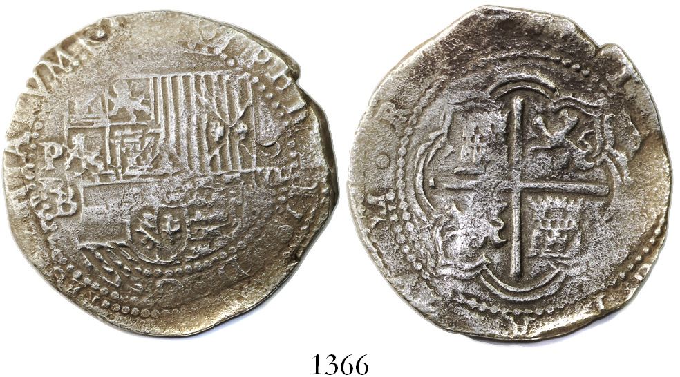 Potosi, Bolivia, cob 8 reales, Philip II, assayer B (4th period).