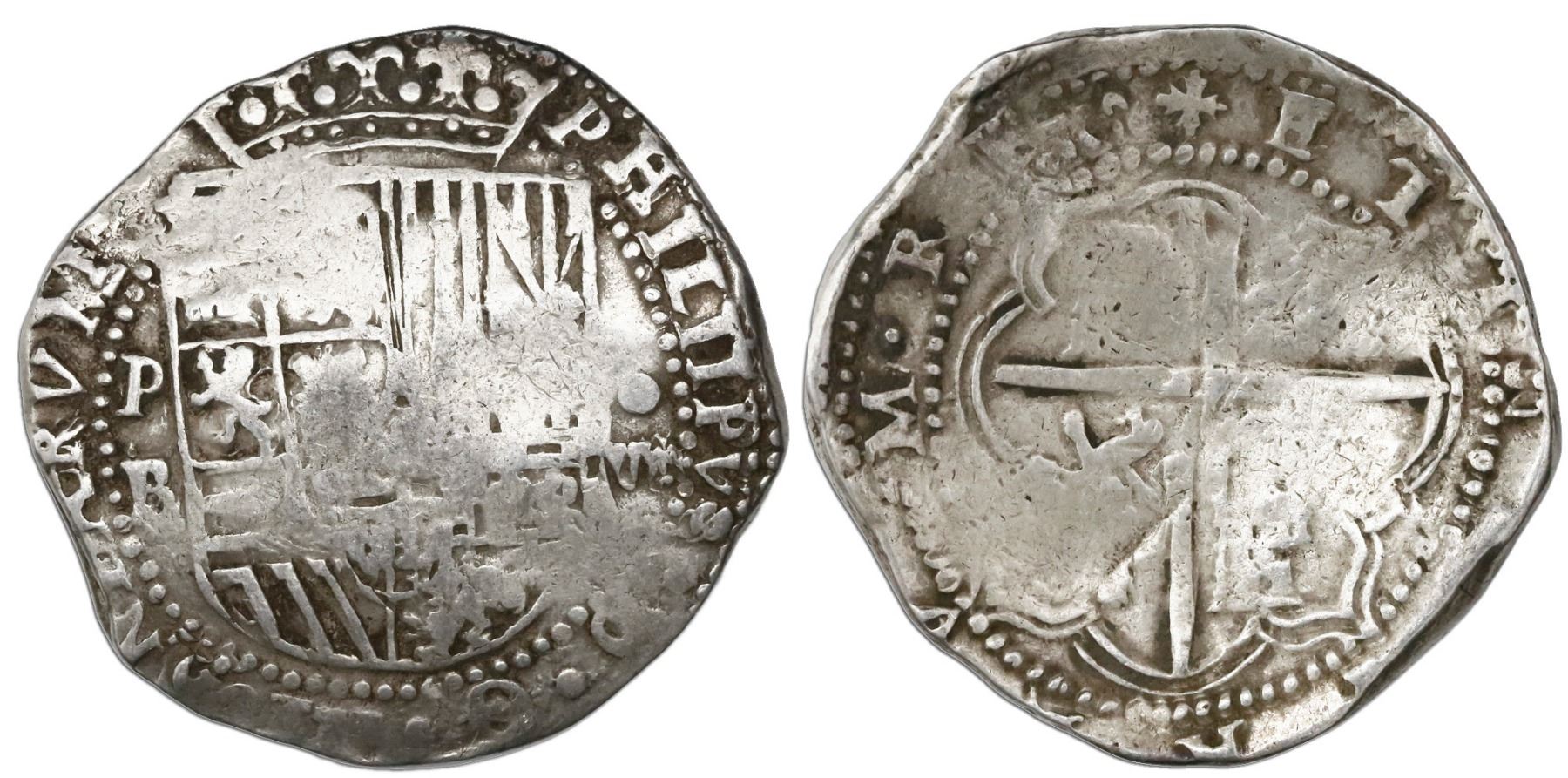Potosi, Bolivia, cob 8 reales, Philip II, assayer B (4th period). S-P12; KM-5.1. 27.08 grams. AVF with weak centers, choice full crown, bold full PHILIPPVS, light sediment in crevices.