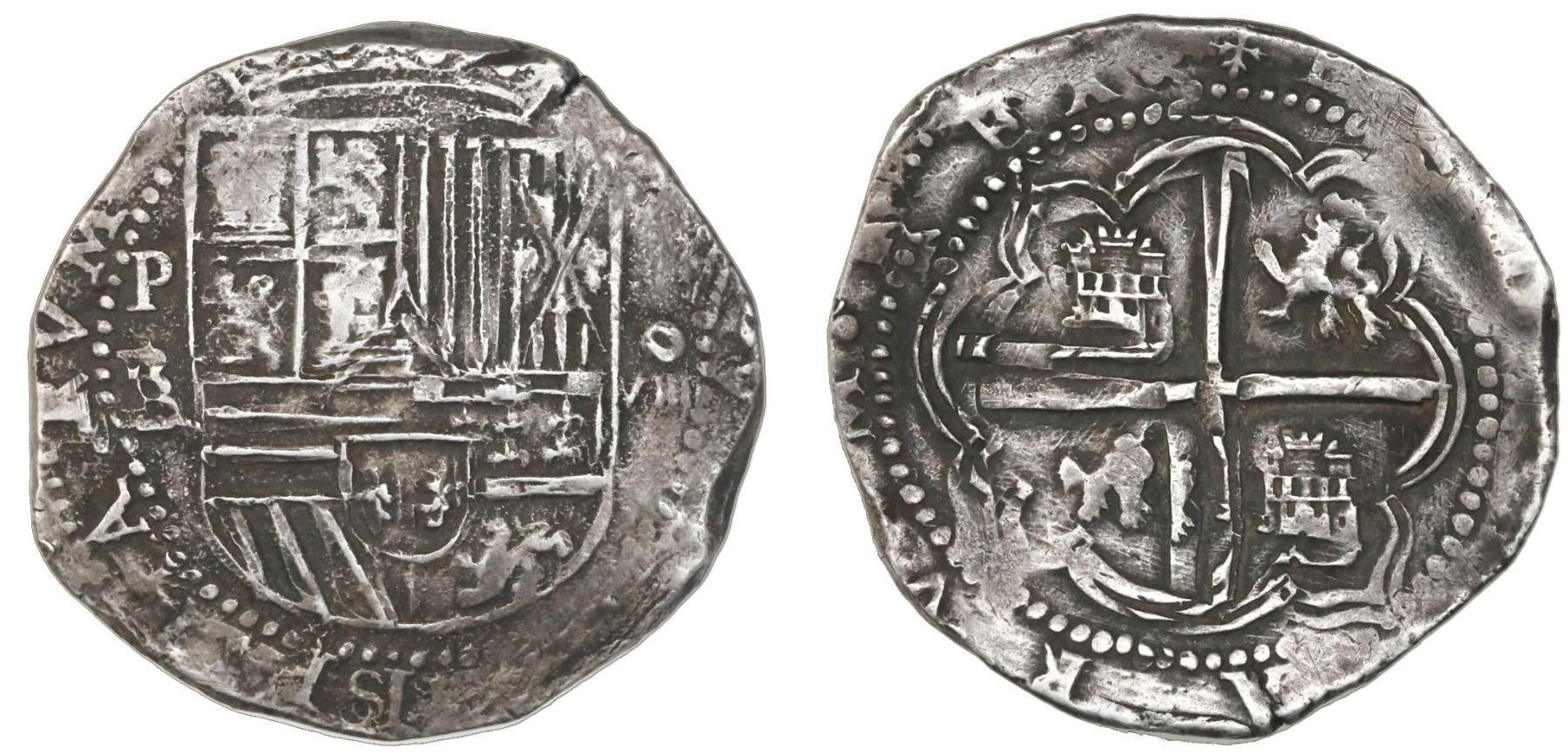 Potosi, Bolivia, cob 8 reales, Philip II, assayer B (4th period). S-P12; KM-5.1. 27.18 grams. Excellent full shield and cross, both very well detailed but the cross-lions-castles particularly bold, full P-B (the assayer slightly doubled), attractively toned XF+.