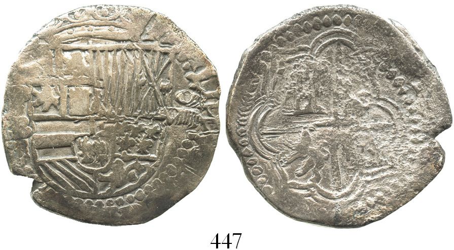 Potosi, Bolivia, cob 8 reales, Philip II, assayer B (5th period), Grade 1, ex-Hebert. S-P14. 25.5 grams. Solid coin with good full shield, bold denomination, full but lightly corroded cross, faintly toned all over. From the Hebert collection, with Fisher/Miguel photo-certificate #H634. Recovered from: Atocha, sunk in 1622 west of Key West, Florida