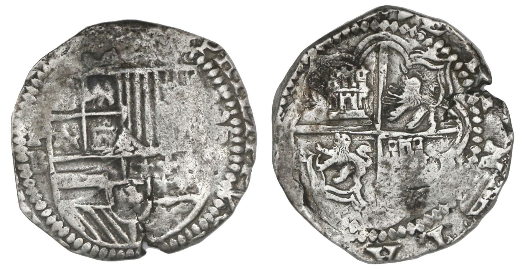 Potosi, Bolivia, cob 8 reales, Philip II, assayer B (5th period), Grade 1. S-P14. 26.42 grams. Good full shield and cross with some flat areas, toned in crevices, minimal surface corrosion, edge-crack. With Fisher tag and photo-certificate #7436. Recovered from: Santa Margarita, sunk in 1622 west of Key West, Florida