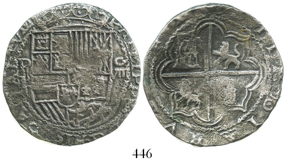 Potosi, Bolivia, cob 8 reales, Philip II, assayer B (5th period), borders of x's, "50 points" (choic