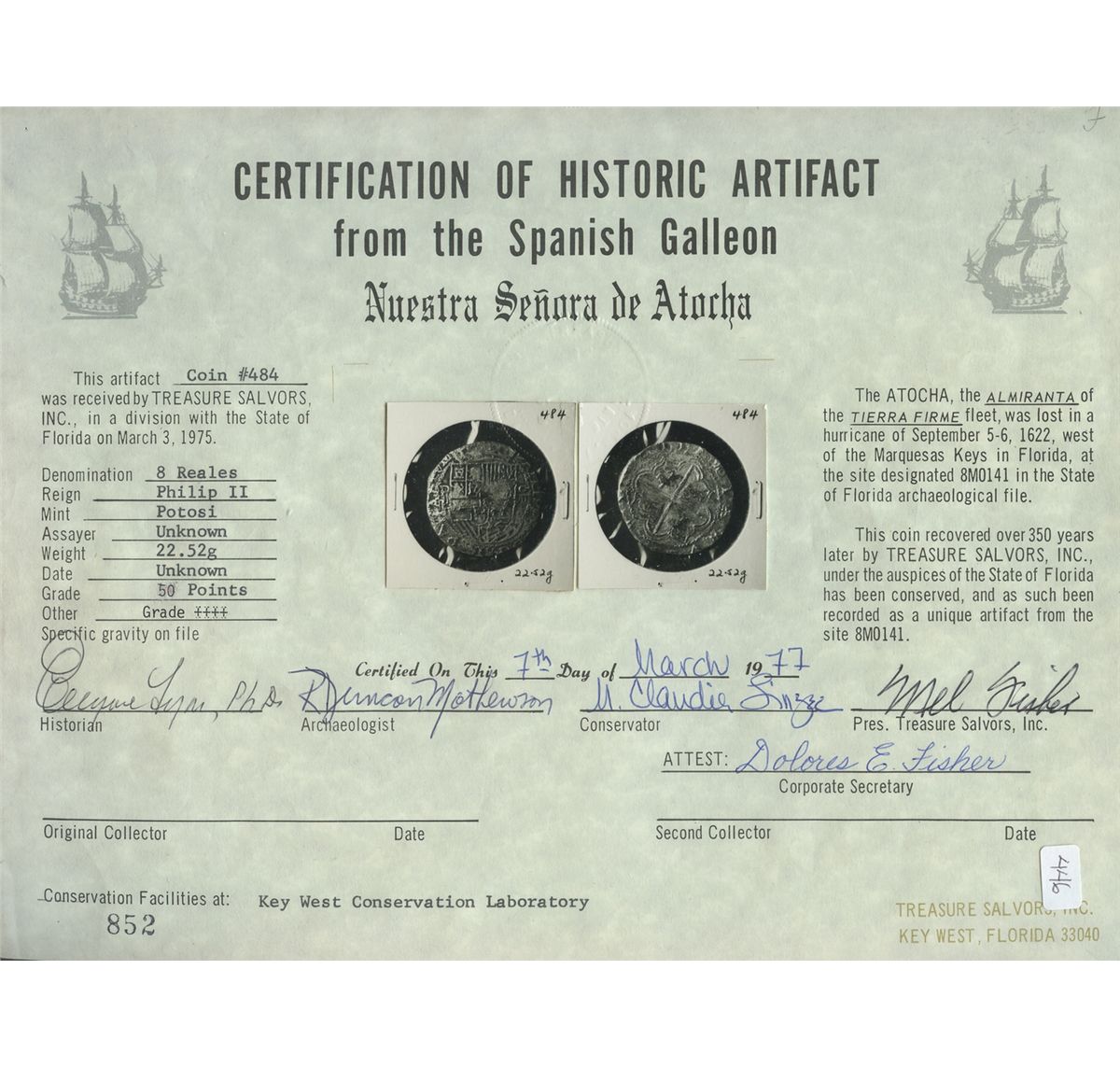 Potosi, Bolivia, cob 8 reales, Philip II, assayer B (5th period), borders of x's, "50 points" (choice), with hand-signed Fisher certificate. S-P14; KM-5.5. 22.8 grams. Superb full cross and shield despite very light surface corrosion, nicely toned, bold mintmark and denomination but the assayer a bit doubled. With hand-signed Fisher photo-certificate #852 dated March 7, 1977. Recovered from: Atocha, sunk in 1622 west of Key West, Florida