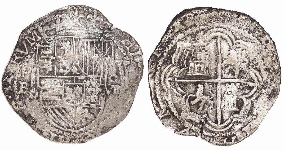Potosi, Bolivia, cob 8 reales, Philip II, assayer B (5th period), borders of x's.