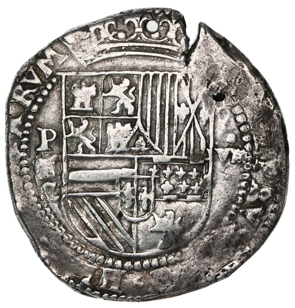 Potosi, Bolivia, cob 8 reales, Philip II, assayer C below erasure, very rare, ex-Karon. S-P5; KM-5.1; Cal-671. 26.86 grams. Typically large flan with choice full shield (sharply detailed) and cross (slightly doubled), most of crown and some legend, AXF with nice light toning, tiny hole at top of shield next to edge-split plus smaller, cruder hole inside plug near right end of cross, desirable pedigree. Pedigreed to the Paul Karon collection (Ponterio auction of March 1990, lot #8) and to the Cayon auction of February 2012 (lot #96).