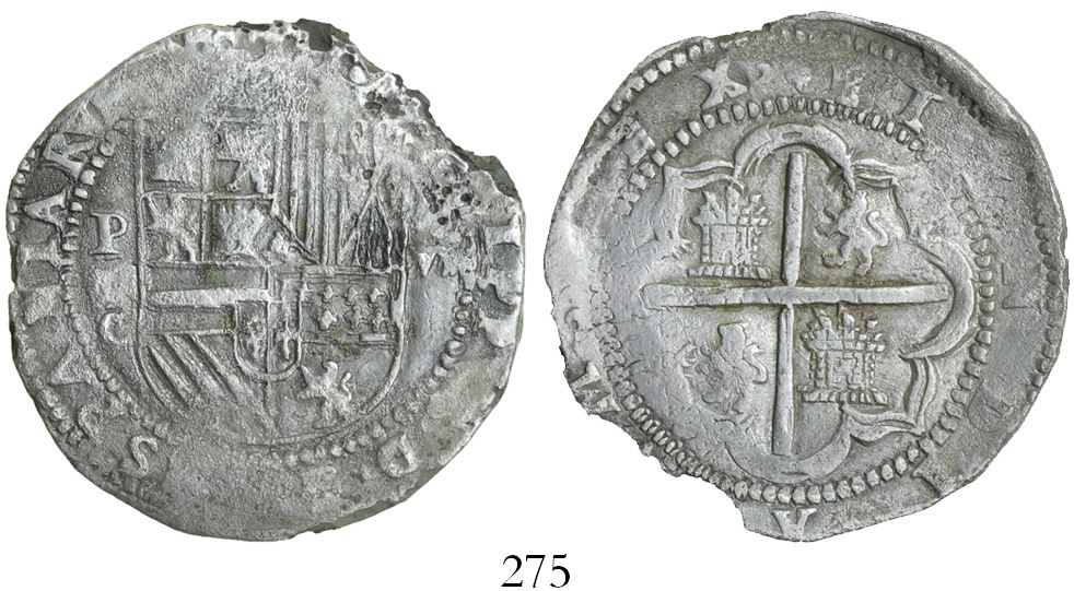 Potosi, Bolivia, cob 8 reales, Philip II, assayer C below erasure, very rare. S-P5; KM-5.1; CT-136 (under La Plata). 25.19 grams. Mostly solid specimen (just some loss on about 30% of the edge) with full and clear shield and cross and much legend, the all-important P-erasure-C very clear, light but uneven toning, numismatically popular issue that was once attributed to La Plata. Recovered from: Unidentified ca.-1590 wreck off the Yucatan peninsula of Mexico
