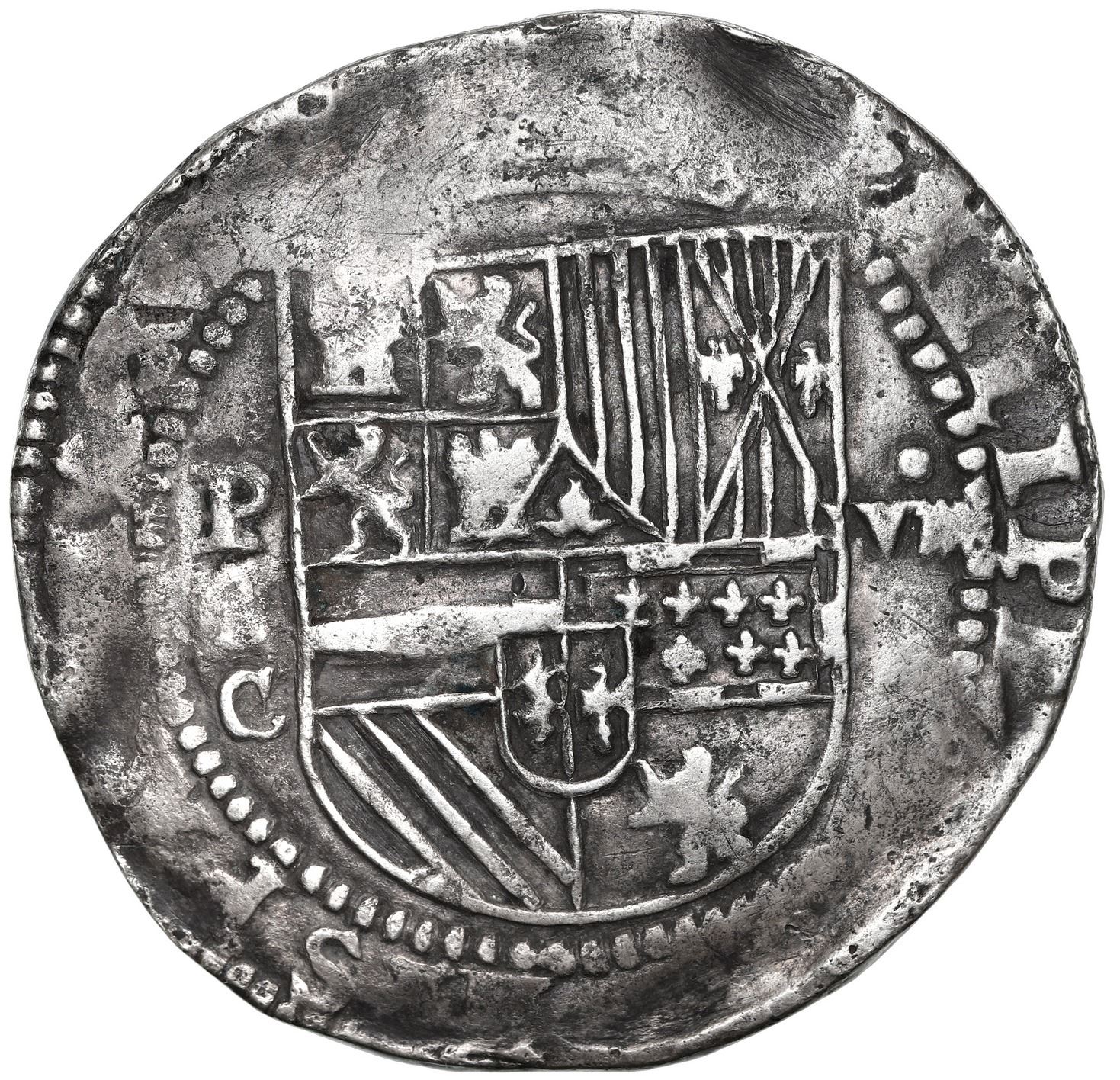 Potosi, Bolivia, cob 8 reales, Philip II, assayer C below erasure, very rare. S-P5; KM-5.1; Cal-671. 27.03 grams. Broad flan with choice full shield boldly flanked by P-erasure-C (the erasure clearly containing at least some combination with assayer B) to left and denomination o-VIII to right, choice full cross-lions-castles and tressure, some legend despite peripheral flatness, beautifully toned XF, an excellent example of this traditional rarity that was claimed by Sellschopp to be evidence of striking in La Plata, an error that was publicly eradicated by Cunietti in 1988 but still persists in older catalogs and references.