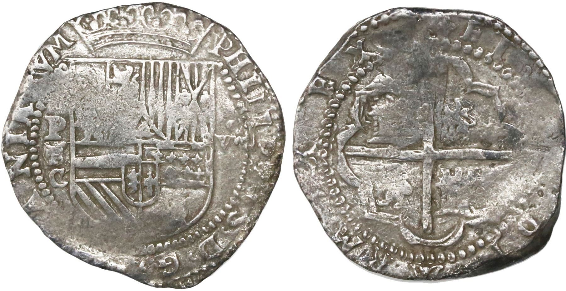 Potosi, Bolivia, cob 8 reales, Philip II, assayer C under erasure, very rare. S-P5, KM-5.1; CT-160. 26.70 grams. Typically broad flan with full crown and nearly full legend, very clear C and erasure, in which you can barely make out what is believed to be B/S/X (basically a B made from superimposed S and X punches), full but partially weak cross and shield, Fine with minor corrosion at very edge as from unspecified salvage (possibly Atocha), a celebrated rarity that was once attributed (by Sellschopp) to La Plata in error. Pedigreed to our Auction #6, with original lot-tag #880, and to our Auction #15, with original lot-tag #887.