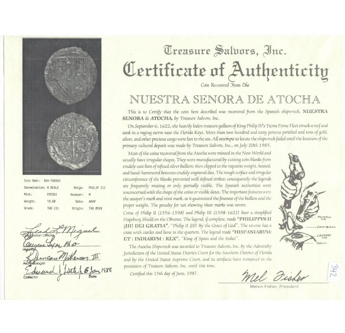 Potosi, Bolivia, cob 8 reales, Philip II, assayer M, very rare second assayer of mint, Grade 2, with Edward J. Little signature on certificate. S-P2; KM-5.1; CT-141. 19.6 grams. With bold P-M to left of well-detailed full shield, distinctively early full cross-and-tressure on other side, this specimen is the first we have ever seen outside the Research Collection and is only slightly less rare than the first issue of the mint under assayer Rincon, with moderate surface corrosion all over but attractively toned, pedigreed to the cartographer who pinpointed the "mother lode" in 1985. With Fisher certificate #188862, and pedigreed to the Edward J. Little collection. Recovered from: Atocha, sunk in 1622 west of Key West, Florida