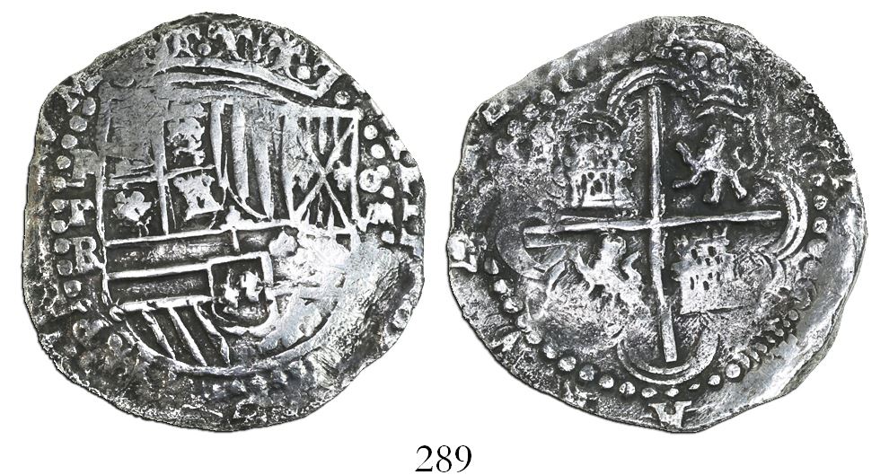 Potosi, Bolivia, cob 8 reales, Philip II, assayer RL, Grade 1. S-P13; KM-5.1; CT-159. 24.58 grams. Bold full crown and shield and cross and P-RL with contrast enhanced by dark toning on fields, some doubling and minor localized surface corrosion. With Fisher photo-certificate #220126. Recovered from: Atocha, sunk in 1622 west of Key West, Florida