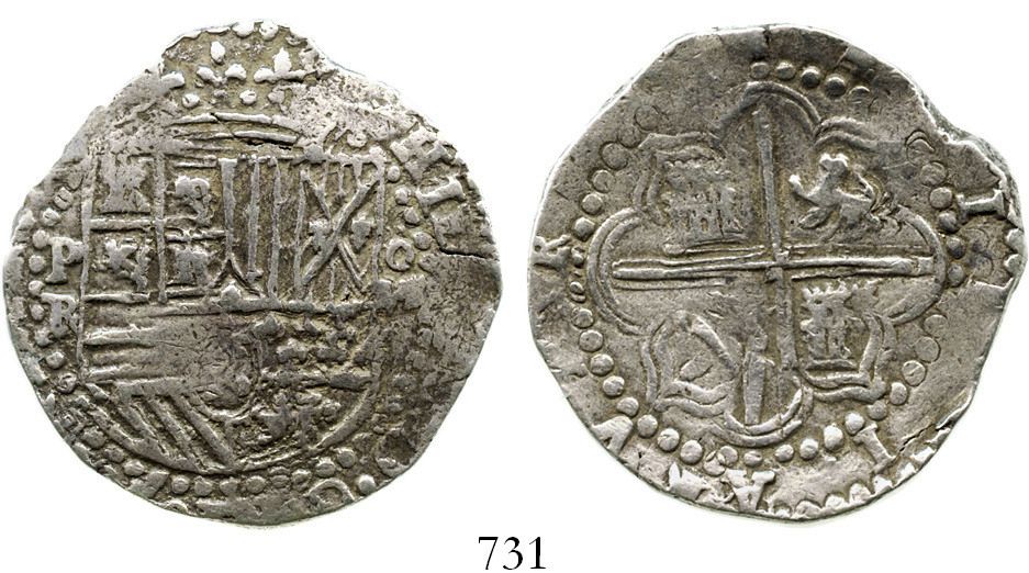 Potosi, Bolivia, cob 8 reales, Philip II, assayer RL. S-P13; KM-5.1; CT-159. 27.4 grams. Excellent full shield and cross, the latter slightly doubled, with bold full P-RL, nicely toned VF, very well struck for this issue.