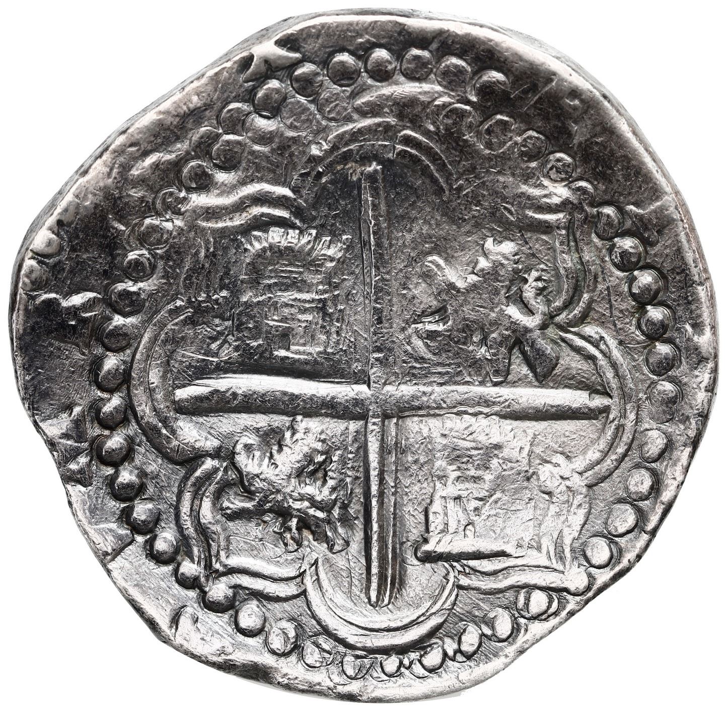 Potosi, Bolivia, cob 8 reales, Philip II assayer RL. S-P13; KM-5.1; Cal-675. 27.06 grams. Choice full shield and cross (no flatness or doubling), with bold full P-RL, much legend including full king's name, XF with light toning over slightly shiny surfaces.