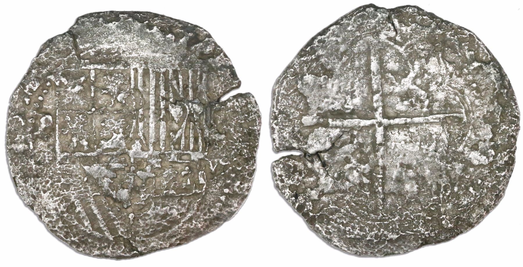 Potosi, Bolivia, cob 8 reales, Philip II, assayer not visible (4th-period B), Grade-2 quality but Grade 1 on the certificate. KM-5.1. 22.10 grams. Solid coin with full shield and cross despite moderate surface corrosion, small edge-split, toned. With old Fisher photo-certificate #1796 from 1984. Recovered from: Atocha, sunk in 1622 west of Key West, Florida