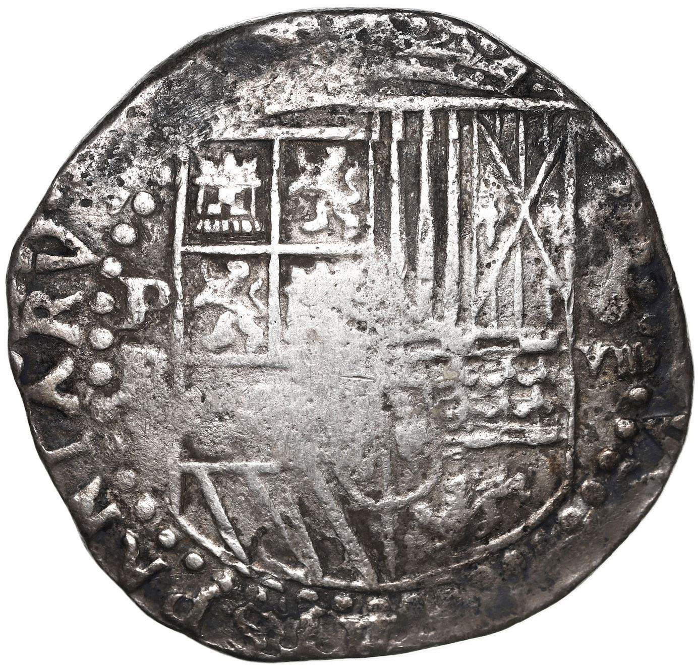 Potosi, Bolivia, cob 8 reales, Philip III, assayer B (3rd period). S-P10; KM-5.1; Cal-672. 26.87 grams. Good full shield and cross despite central weakness due to flan concavity, also with full P-B and denomination, VF with dark toning in peripheries.