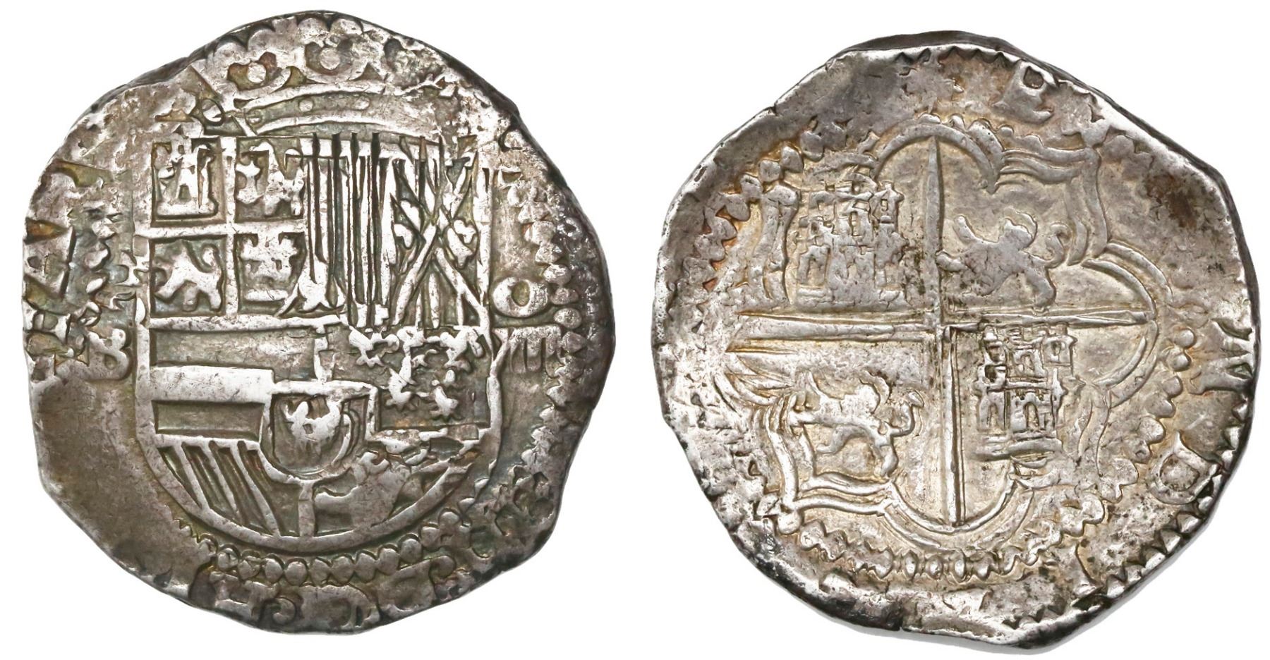 Potosi, Bolivia, cob 8 reales, Philip III, assayer B, rare. S-P14a; KM-10; CT-121. 27.04 grams. Smaller flan than usual, with choice full shield and crown and cross (all very slightly doubled), clear king's ordinal III in legend, richly toned XF.