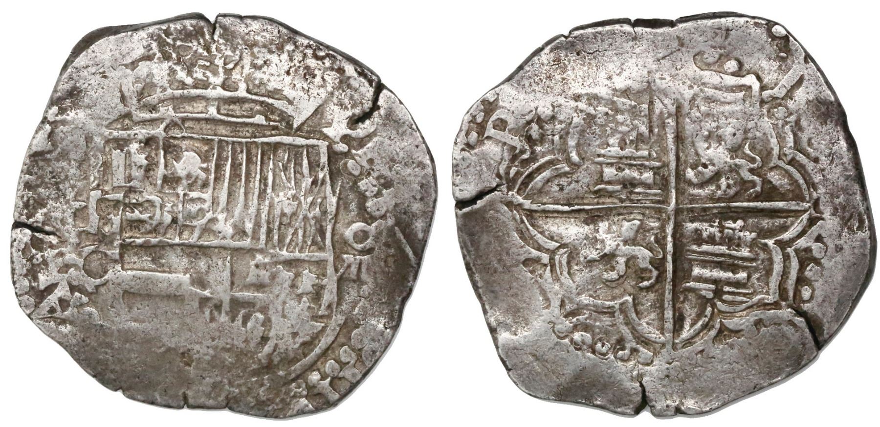 Potosi, Bolivia, cob 8 reales, Philip III, assayer C or C/Q, rare. S-P16; KM-10. 26.98 grams. Good full crown and shield and cross but peripheries crude, full P-C with open right side up against shield and possible tail at very bottom left, lightly toned VF+.