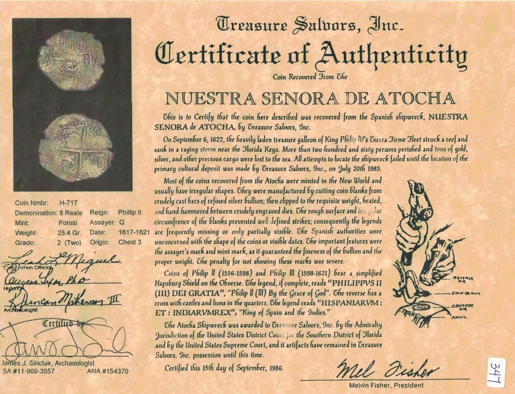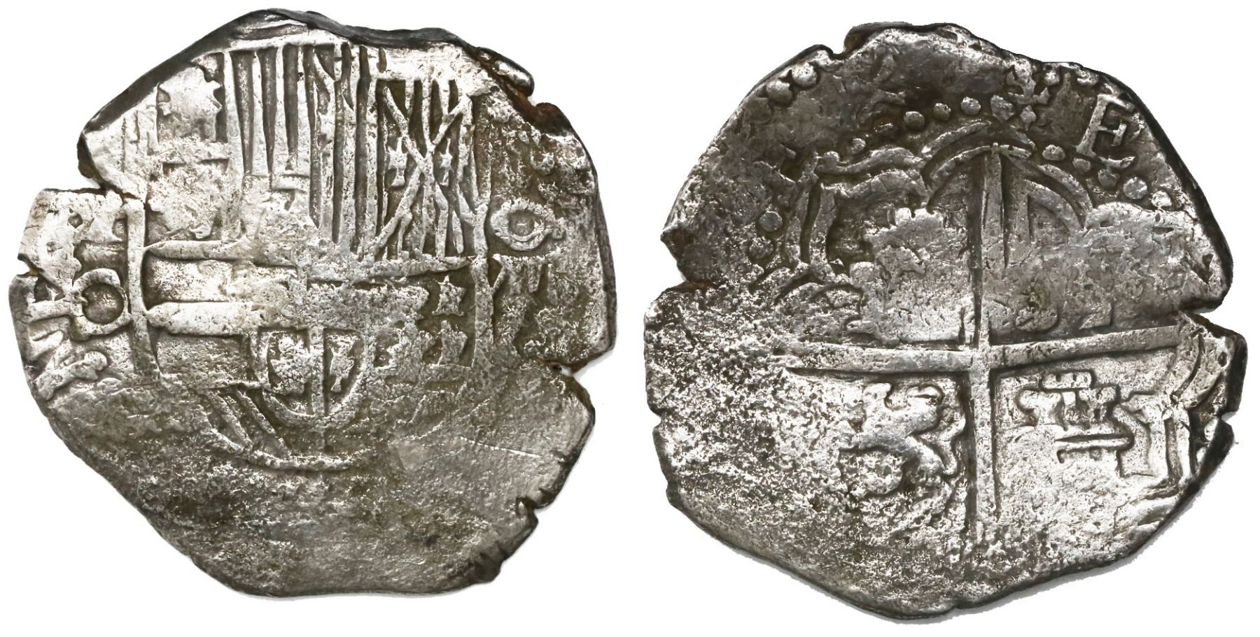 Potosi, Bolivia, cob 8 reales, Philip III, assayer C (rare), Grade 2. S-P16; KM-10. 25.46 grams. Bold assayer, full shield with odd doubling at top placing Aragon and Naples over Castile and Leon, full but weak cross, solid and essentially uncorroded. With Fisher/Sinclair certificate #H-717. Recovered from: Atocha, sunk in 1622 west of Key West, Florida
