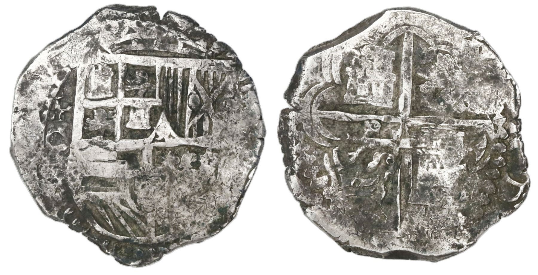 Potosi, Bolivia, cob 8 reales, Philip III, assayer C, rare. S-P16; KM-10. 27.30 grams. Very crude, with surfaces that almost seem hammered flat (VG overall) but with clear P-C and most of cross and shield, some spotty/crusty toning.