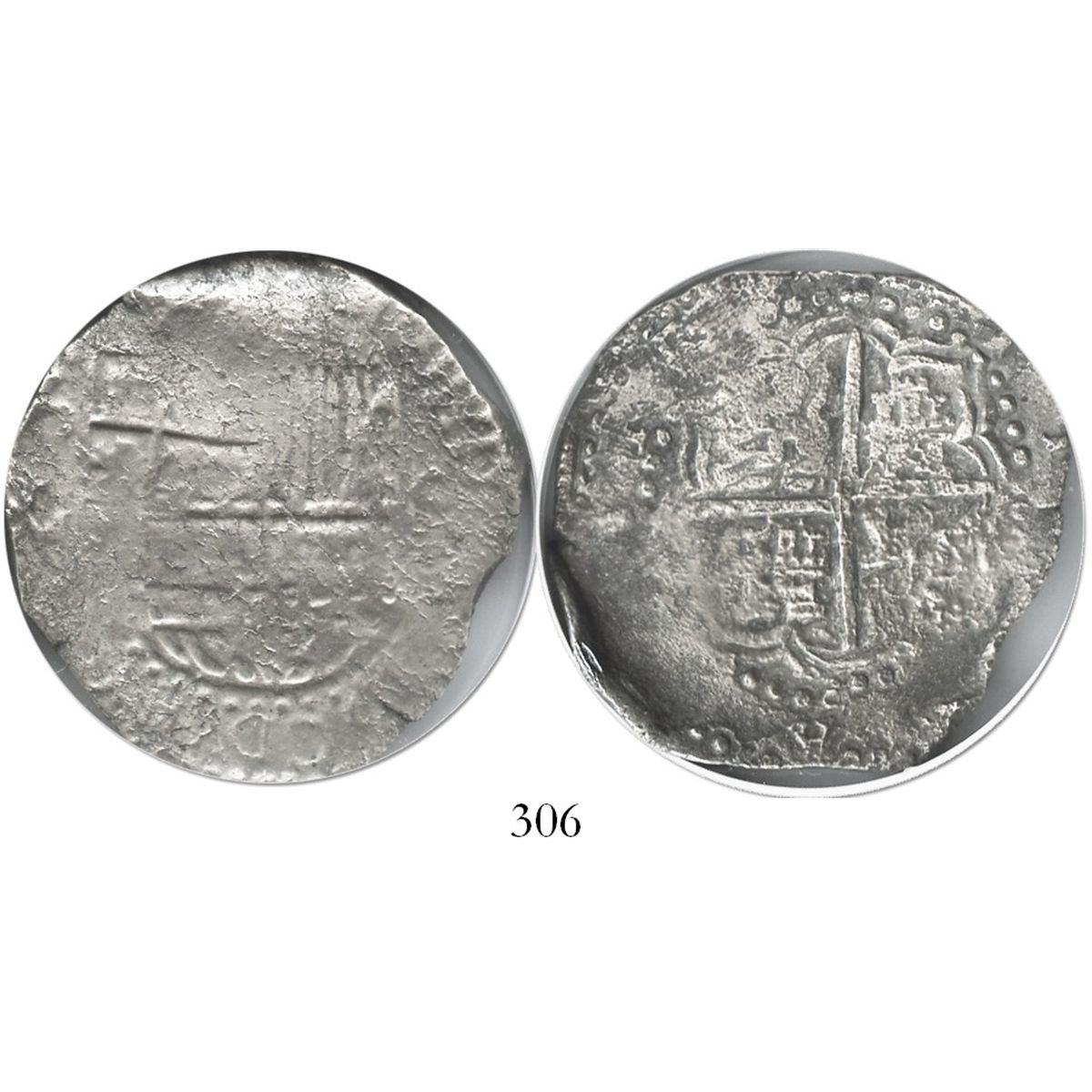 Potosi, Bolivia, cob 8 reales, Philip III, assayer M, quadrants of cross transposed, Grade 1.