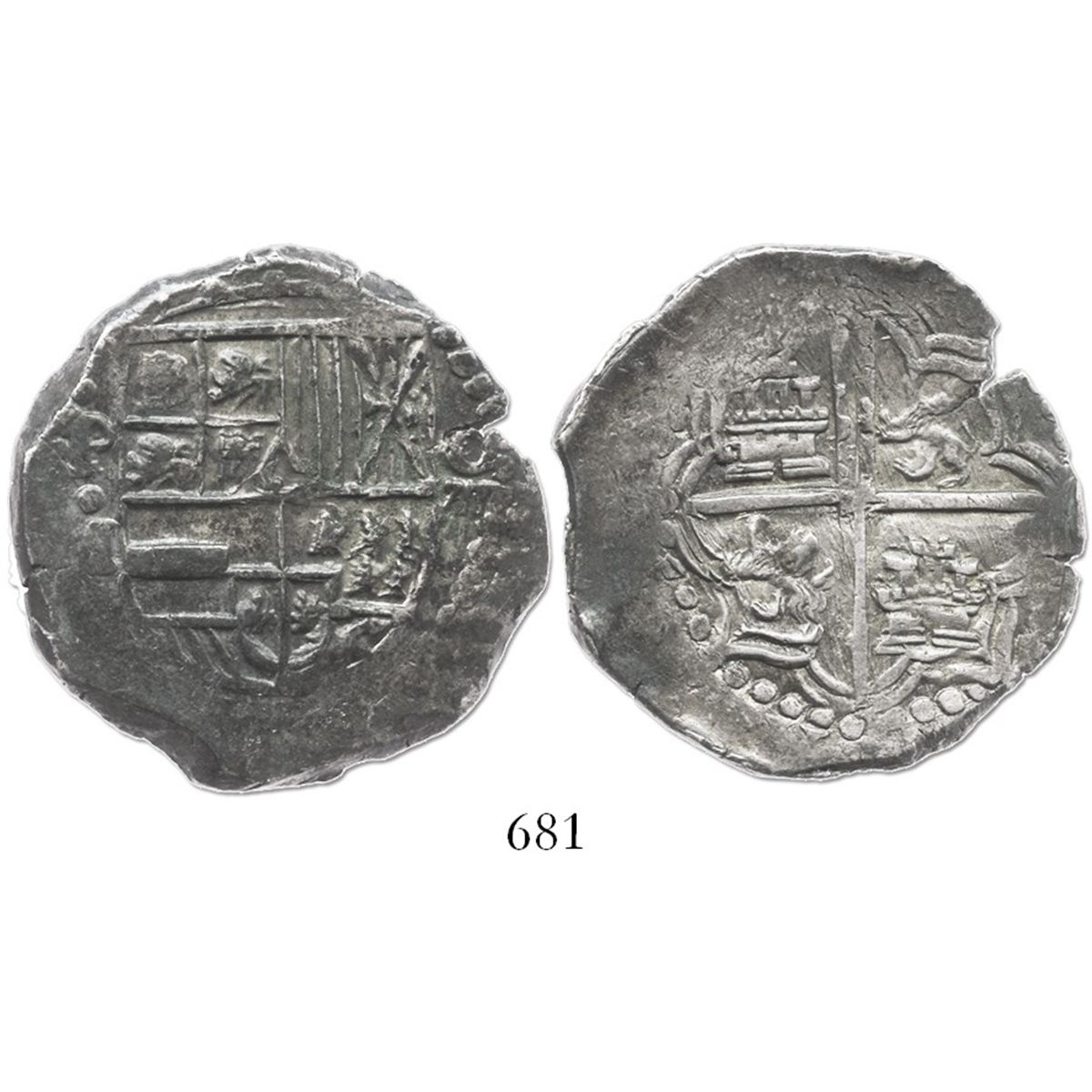 Potosi, Bolivia, cob 8 reales, Philip III, assayer M. S-P18; KM-10; CT-123. 27.4 grams. Deeply toned XF, nice full shield and cross, well-centered, not much peripheral data.