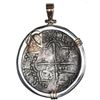 Potosi, Bolivia, cob 8 reales, Philip III, assayer Q, Grade 1, ex-Atocha (1622), mounted cross-side out in silver bezel with 14K gold prongs and conquistador embellishment and shackle bail. 42.40 grams total. Broad flan with much legend in addition to the full cross (slightly off-center) and shield, flat in places but not corroded except for part of edge, nicely toned. From the Atocha (1622), with Fisher tag and certificate 219259.