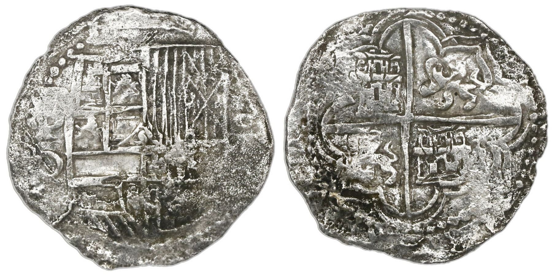 Potosi, Bolivia, cob 8 reales, Philip III, assayer Q, Grade 1, ex-Christie's. S-P17; KM-10; CT-124. 21.76 grams. Great full shield and cross, a few dark spots, corroded around edge. With Fisher tag and photo-certificate #167797, pedigreed to lot 268 of the original Christie's (New York) Atocha auction of June 1988. Recovered from: Atocha, sunk in 1622 west of Key West, Florida
