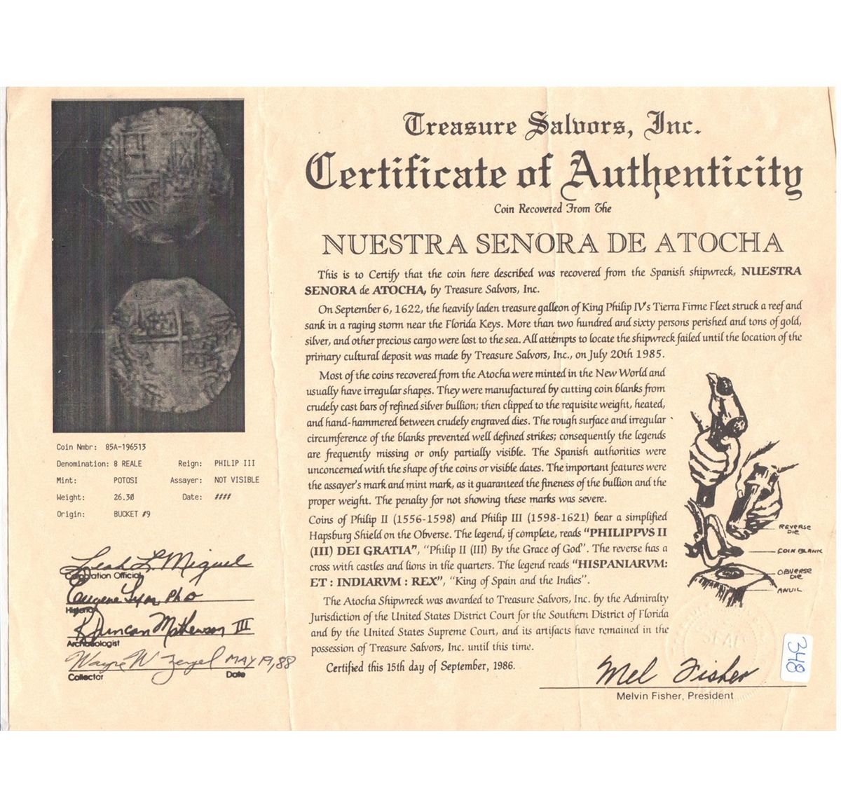 Potosi, Bolivia, cob 8 reales, Philip III, assayer Q, Grade-1 quality but no Grade on certificate. S-P17; KM-10; CT-124. 26.7 grams. No corrosion at all, with bold P-Q to left of full shield, full cross, some legend, typically uneven thickness with flat spots, lightly toned. With Fisher certificate #196513 (tag missing). Recovered from: Atocha, sunk in 1622 west of Key West, Florida