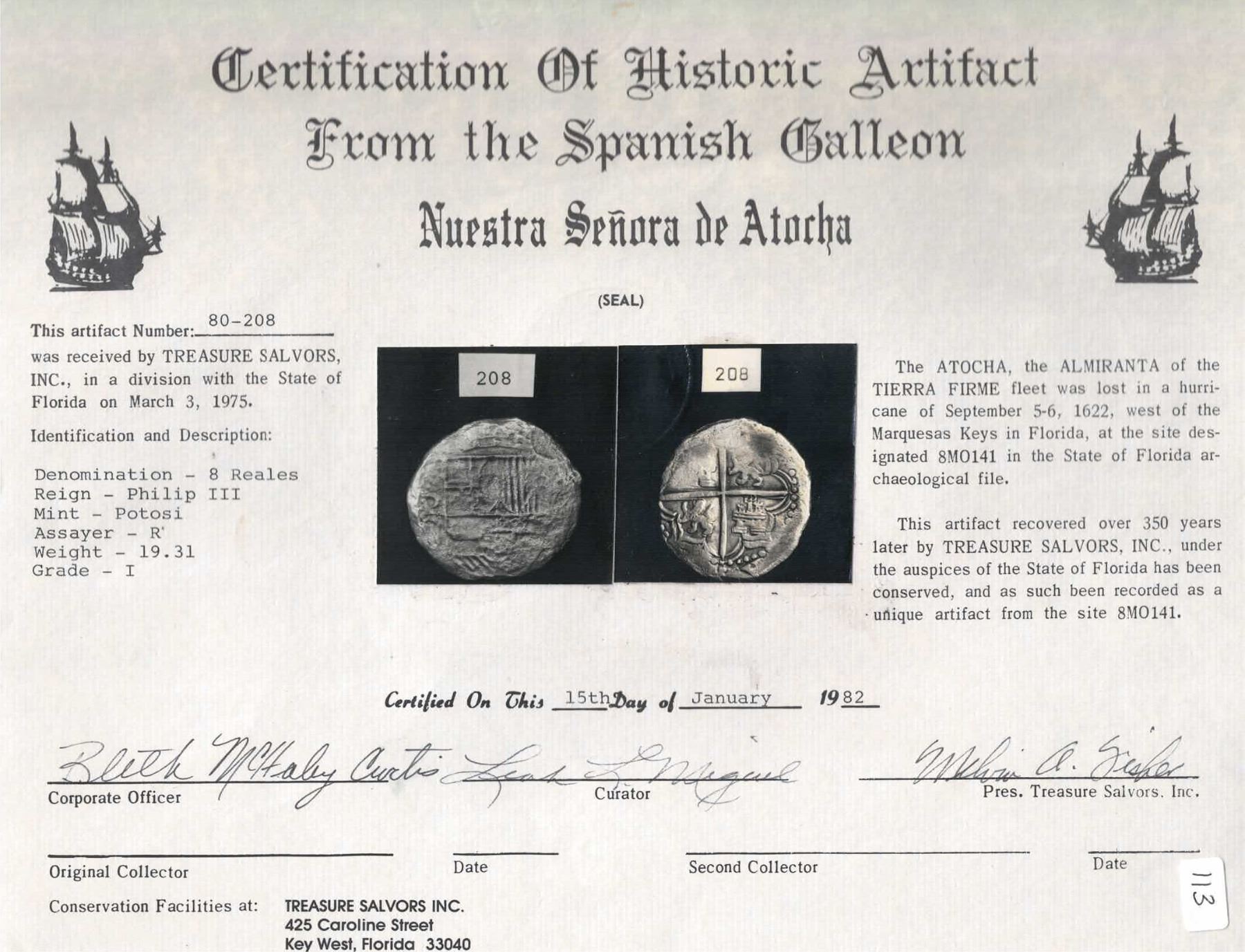 Potosi, Bolivia, cob 8 reales, Philip III, assayer Q, Grade 1, with hand-signed certificate from 1982. S-P17; KM-10; Cal-916. 19.41 grams. Bold full cross, full but corroded shield with clear P-Q to left (in agreement with the tag, but certificate says assayer R), lightly toned all over with a few darker areas, desirable pre-"Mother Lode" certificate. With original Fisher tag and photo-certificate 80-208 from 1982 (425 Caroline Street), hand-signed by Bleth McHaley, pedigreed to the J.P. Silberman Estate.Recovered from: Atocha, sunk in 1622 west of Key West, Florida.