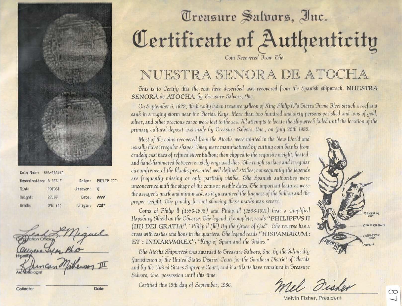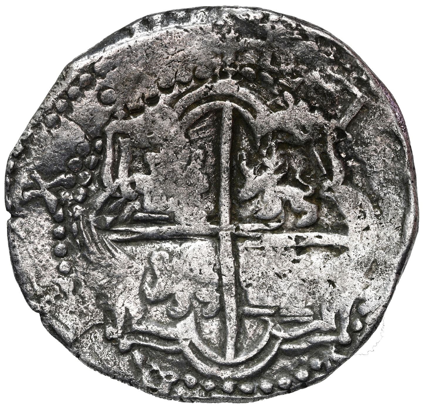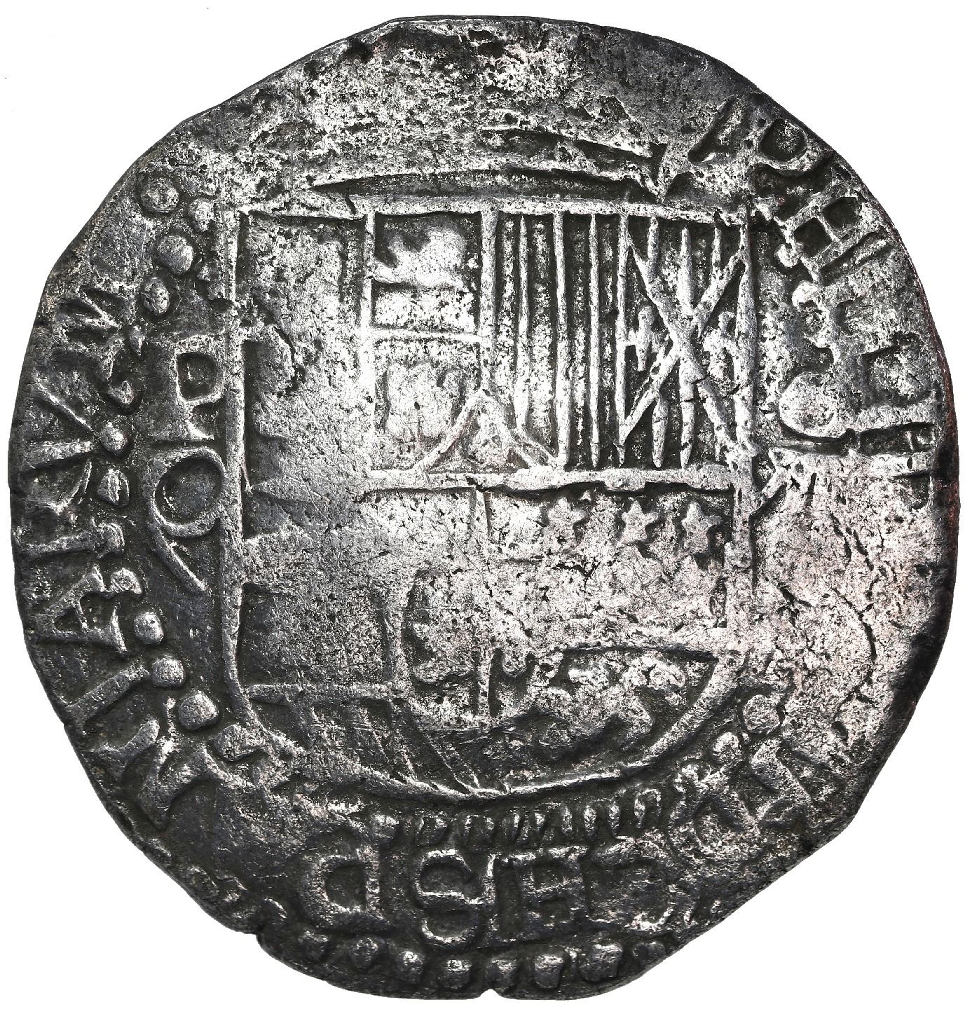 Potosi, Bolivia, cob 8 reales, Philip III, assayer Q, Grade 1. S-P17; KM-10; Cal-916. 27.02 grams. Perfectly round flan with particularly bold P-Q to left of full shield, full legend on that side, the cross also full and bold, toned on fields, no corrosion at all, rather choice for this wreck. With original Fisher tag and certificate 85A-162554, pedigreed to the David Scott Vapnitsky collection. Recovered from: Atocha, sunk in 1622 west of Key West, Florida