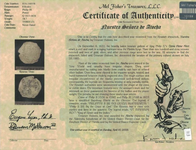 Potosi, Bolivia, cob 8 reales, Philip III, assayer Q, Grade 3. S-P17; KM-10; CT-124. 19.03 gams. Bold full P-Q, full shield and cross, moderately corroded all over with dark encrustation on cross. With Fisher tag and photo-certificate #140558. Recovered from: Atocha, sunk in 1622 west of Key West, Florida