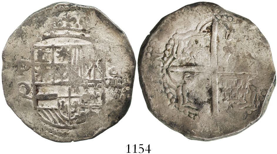 Potosi, Bolivia, cob 8 reales, Philip III, assayer Q. S-P17; KM-10; CT-124. 26.8 grams. Broad, round flan with good full shield and nearly full crown, full but weak cross, the peripheries all flat, otherwise Fine with spots of toning.