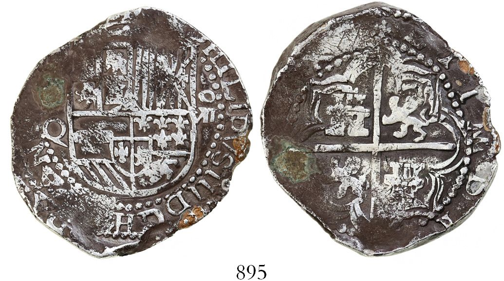 Potosi, Bolivia, cob 8 reales, Philip III, assayer Q. S-P17; KM-10; CT-124. 27.10 grams. Broad flan (uneven thickness) with full king's name and ordinal in legend (rare thus), bold assayer and denomination, good full shield and cross, Fine+ with toning and orange spots.