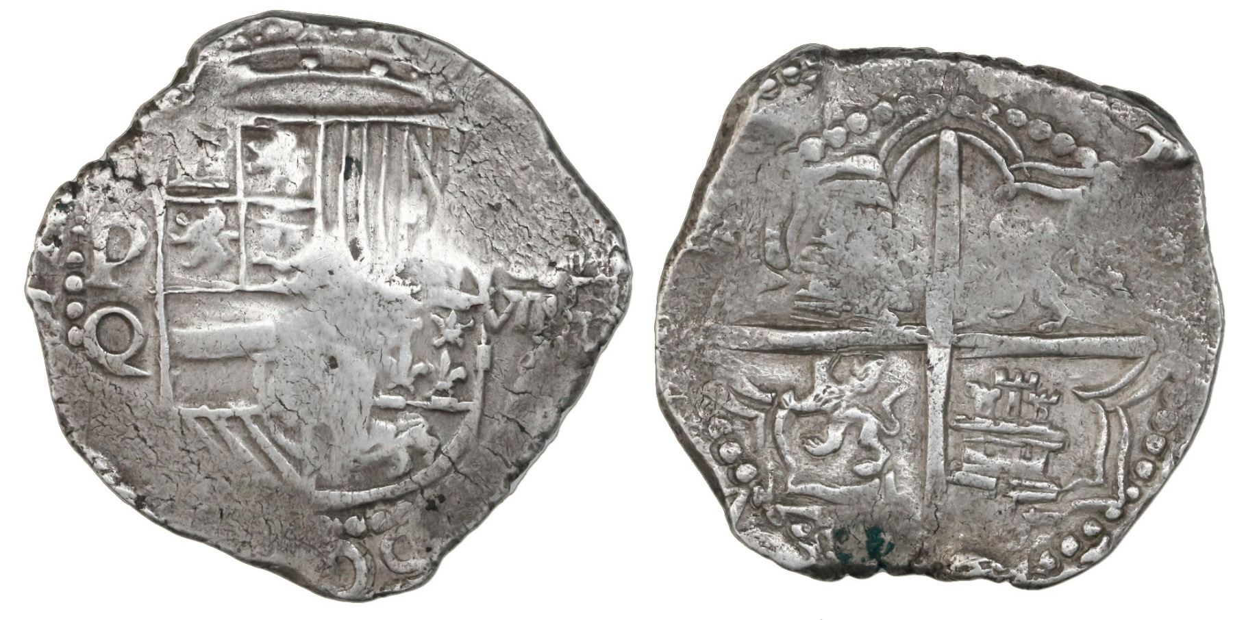 Potosi, Bolivia, cob 8 reales, Philip III, assayer Q. S-P17; KM-10; CT-124. 26.81 grams. Very bold full P-Q, full but partially flat shield and cross, VF+, somewhat barrel-shaped flan.