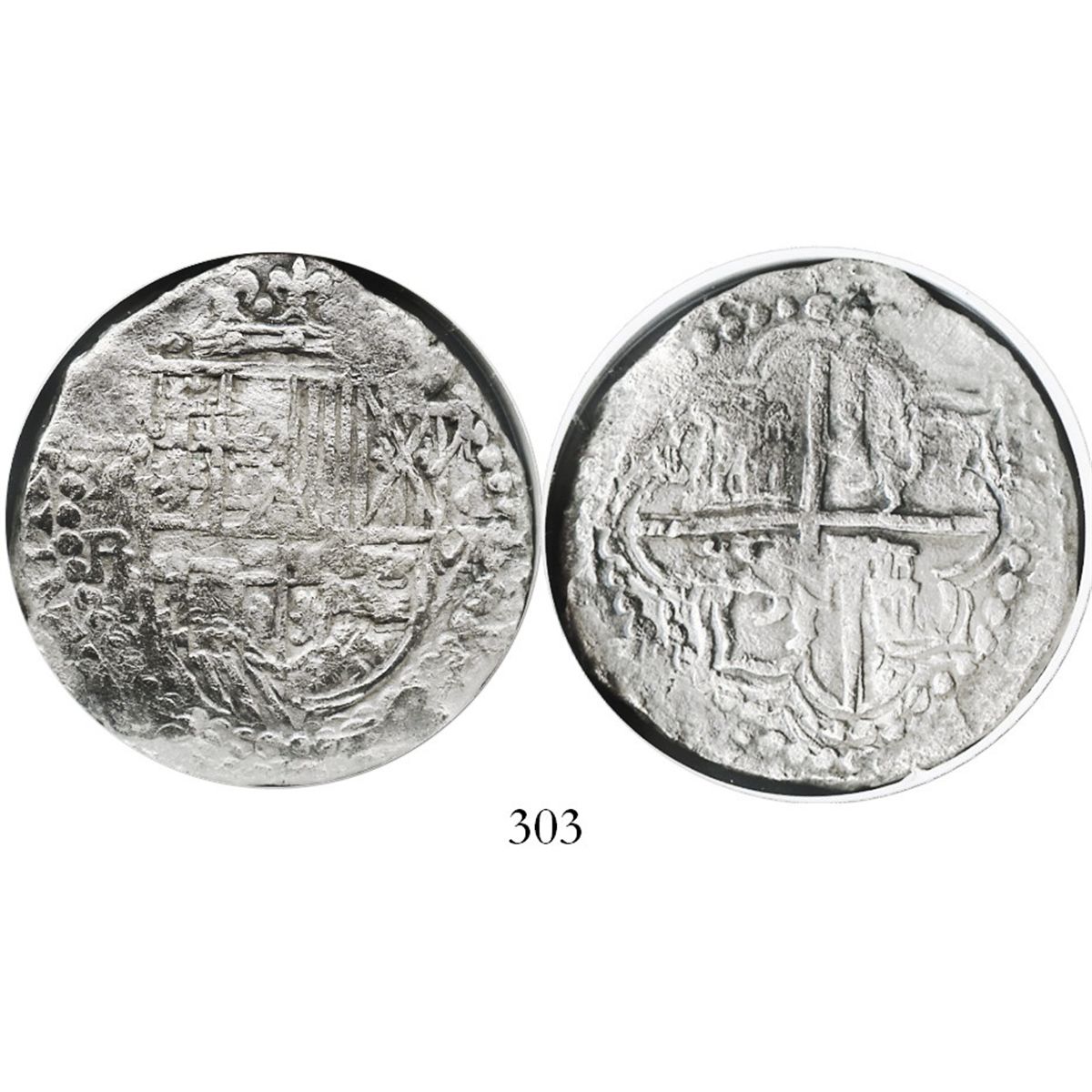 Potosi, Bolivia, cob 8 reales, Philip III, assayer R (curved leg), Grade 1. S-P15; KM-10; CT-126 . Choice full cross and full crown and shield (all slightly doubled), clear assayer R, no corrosion but not much contrast either. Encapsulated by NGC and with Arqueonautas certificate #1973582022, with wooden presentation box. Recovered from: Sao Jose, sunk in 1622 off Mozambique