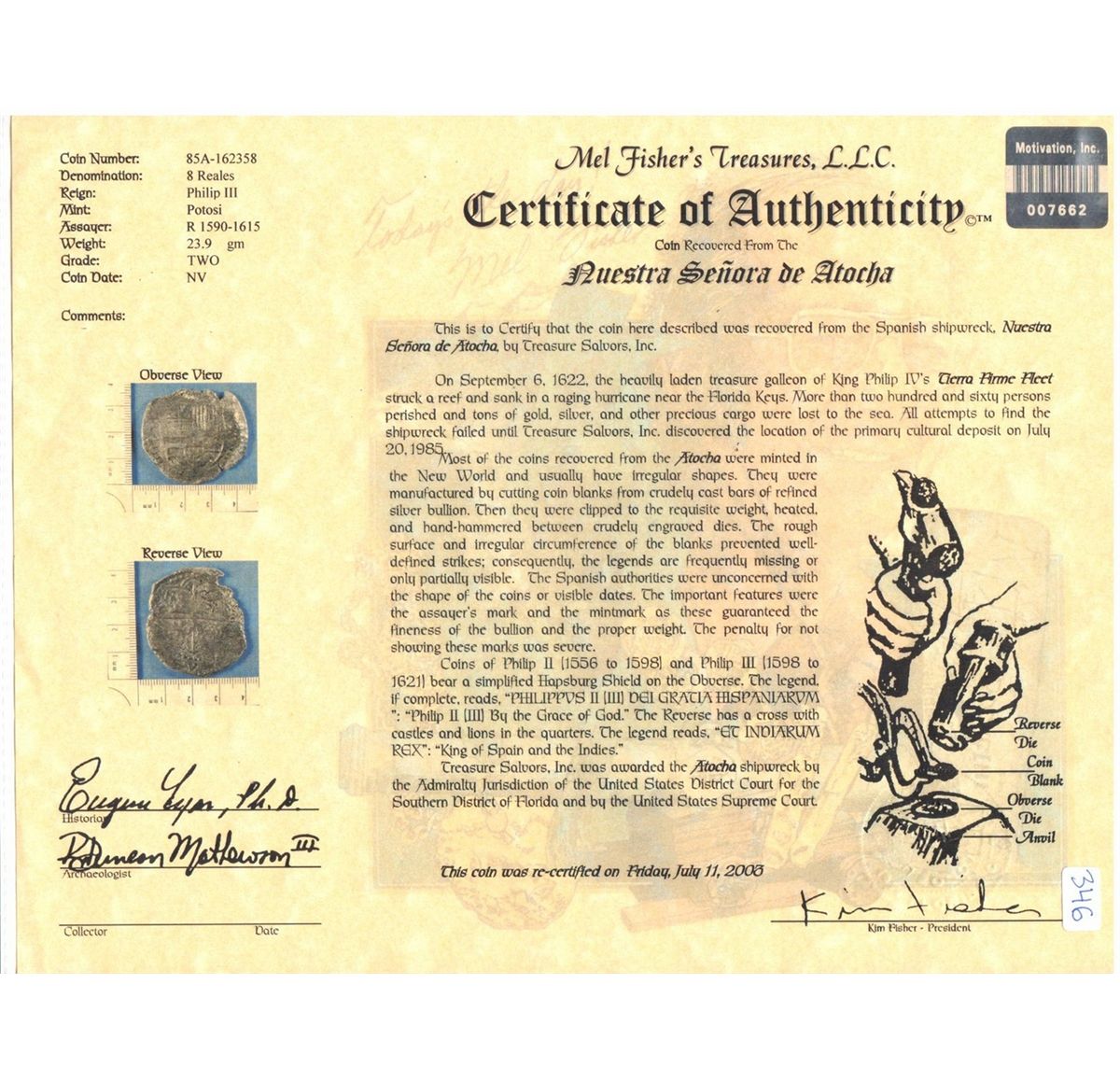 Potosi, Bolivia, cob 8 reales, Philip III, assayer R (curved leg), Grade 2. S-P15; KM-10; CT-126 . 23.9 grams. Broad flan of uneven thickness, with full shield and cross, lightly toned, corroded on parts of edge only. With Fisher certificate #162358. Recovered from: Atocha, sunk in 1622 west of Key West, Florida