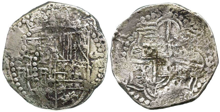 Potosi, Bolivia, cob 8 reales, Philip III, assayer R (curved leg), Grade 2. S-P15; KM-10; CT-126 . 23.5 grams. Solid flan with full but crudely doubled shield and cross, clear assayer R, spots of dark encrustation but not overly corroded. With Fisher certificate #2338 (tag missing). Recovered from: Santa Margarita, sunk in 1622 west of Key West, Florida