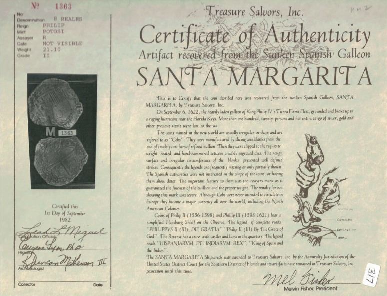 Potosi, Bolivia, cob 8 reales, Philip III, assayer R (curved leg), Grade 2. S-P15; KM-10; CT-126. 21.13 grams. Broad flan with nearly full crown and shield despite moderate corrosion, full cross, good toning. With Fisher tag and photo-certificate #1363. Recovered from: Santa Margarita, sunk in 1622 west of Key West, Florida