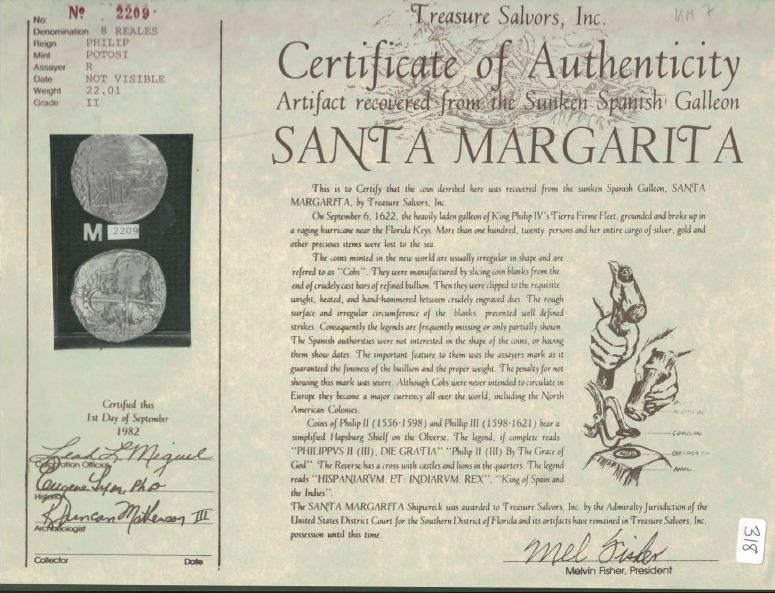 Potosi, Bolivia, cob 8 reales, Philip III, assayer R (curved leg), Grade 2. S-P15; KM-10; CT-126. 22.01 grams. Good full shield and cross despite light to moderate surface corrosion, full P-R, small spots of toning. With Fisher tag and photo-certificate #2209. Recovered from: Santa Margarita, sunk in 1622 west of Key West, Florida