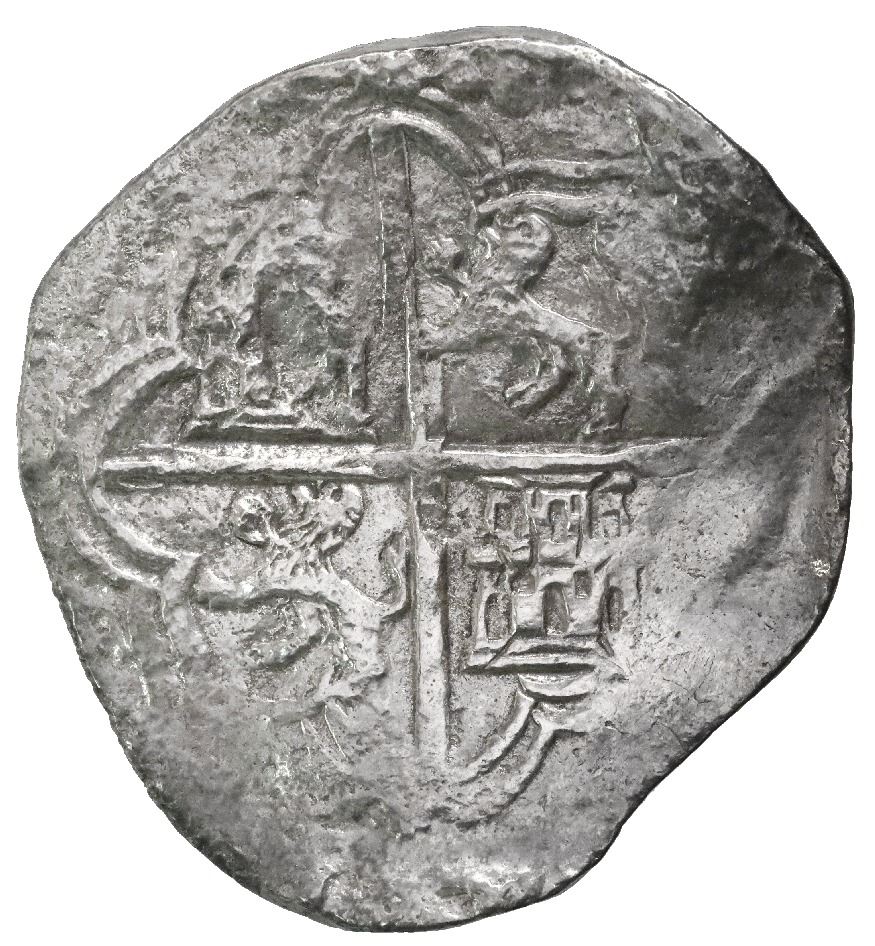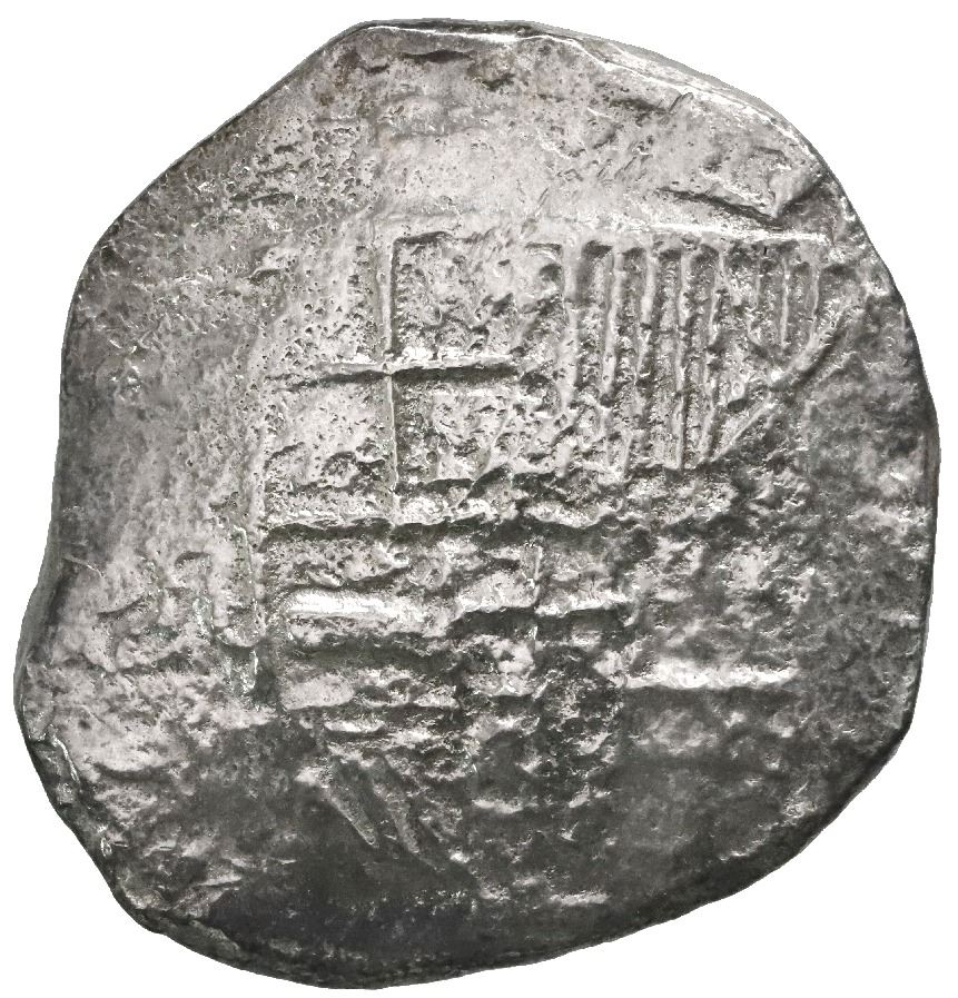 Potosi, Bolivia, cob 8 reales, Philip III, assayer R (curved leg), Grade 3. S-P15; KM-10; Cal-912. 23.70 grams. Bold full cross, full but lightly corroded shield, silvery surfaces, solid overall (especially for the assigned Grade). With Fisher tag and photo-certificate #85A-R98086.From: Atocha, sunk in 1622 west of Key West, Florida