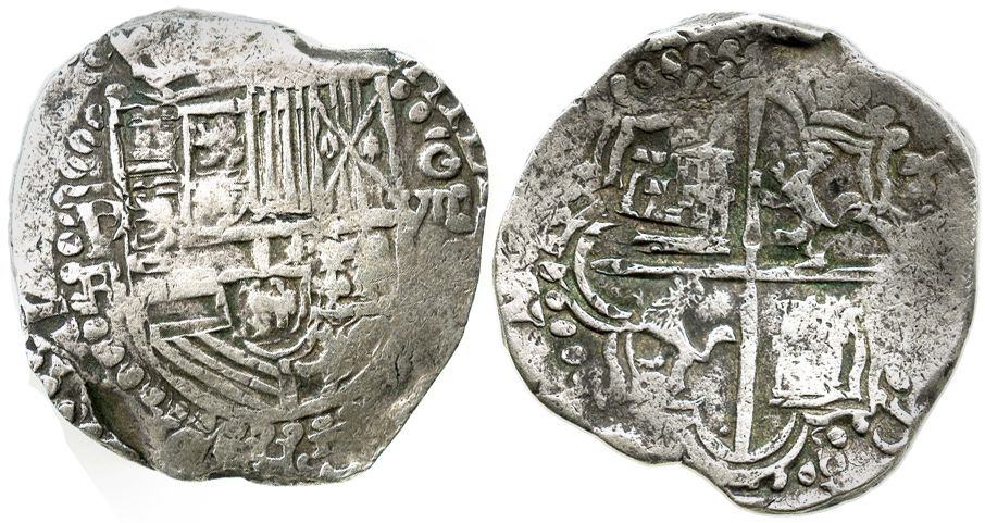 Potosi, Bolivia, cob 8 reales, Philip III, assayer R (curved leg). S-P15; KM-10; CT-126 . 26.3 grams. Bold full shield (slightly doubled) with P-R to left and denomination oVIII to right, the cross also bold and full, with contrasting toning, AVF or so, uneven thickness (as made).