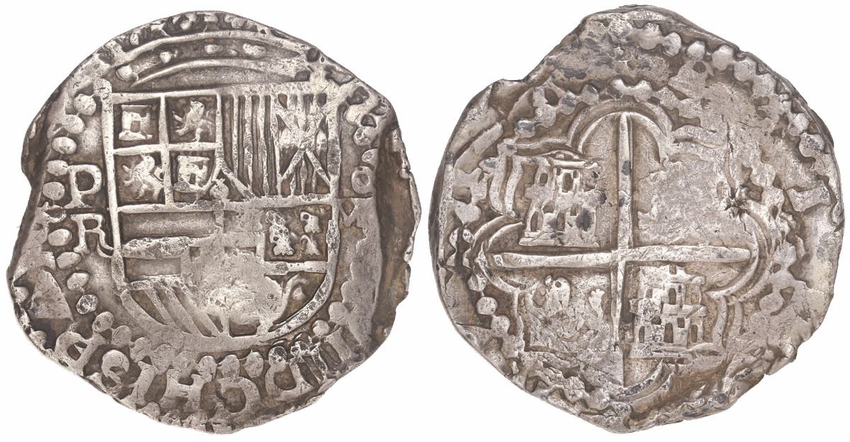 Potosi, Bolivia, cob 8 reales, Philip III, assayer R (curved leg).