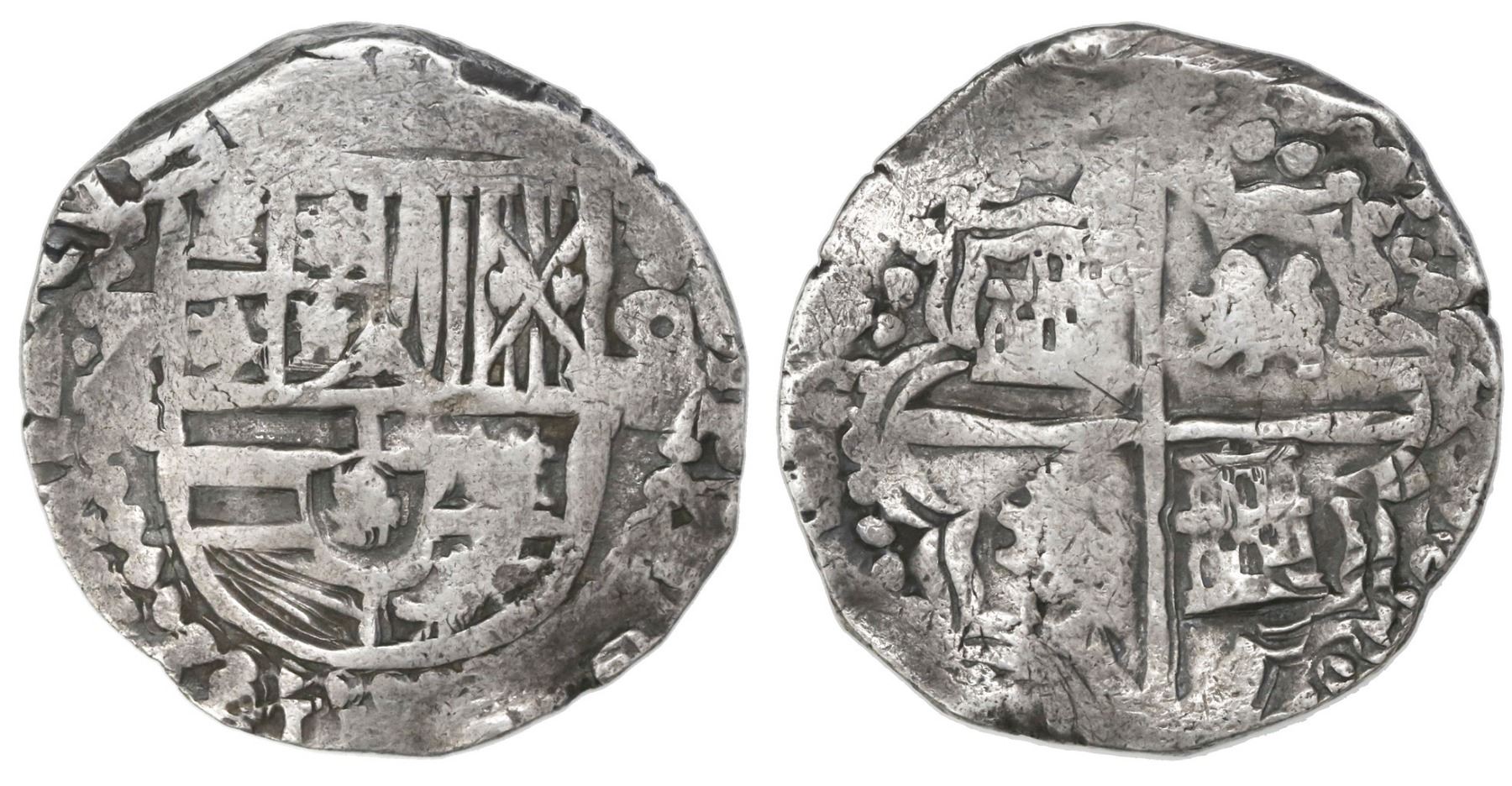 Potosi, Bolivia, cob 8 reales, Philip III, assayer R (curved leg). S-P15; KM-10; CT-126 . 26.37 grams. Good full shield and cross (more evenly struck than most for this assayer), Fine+ with nice toning (darker around details).