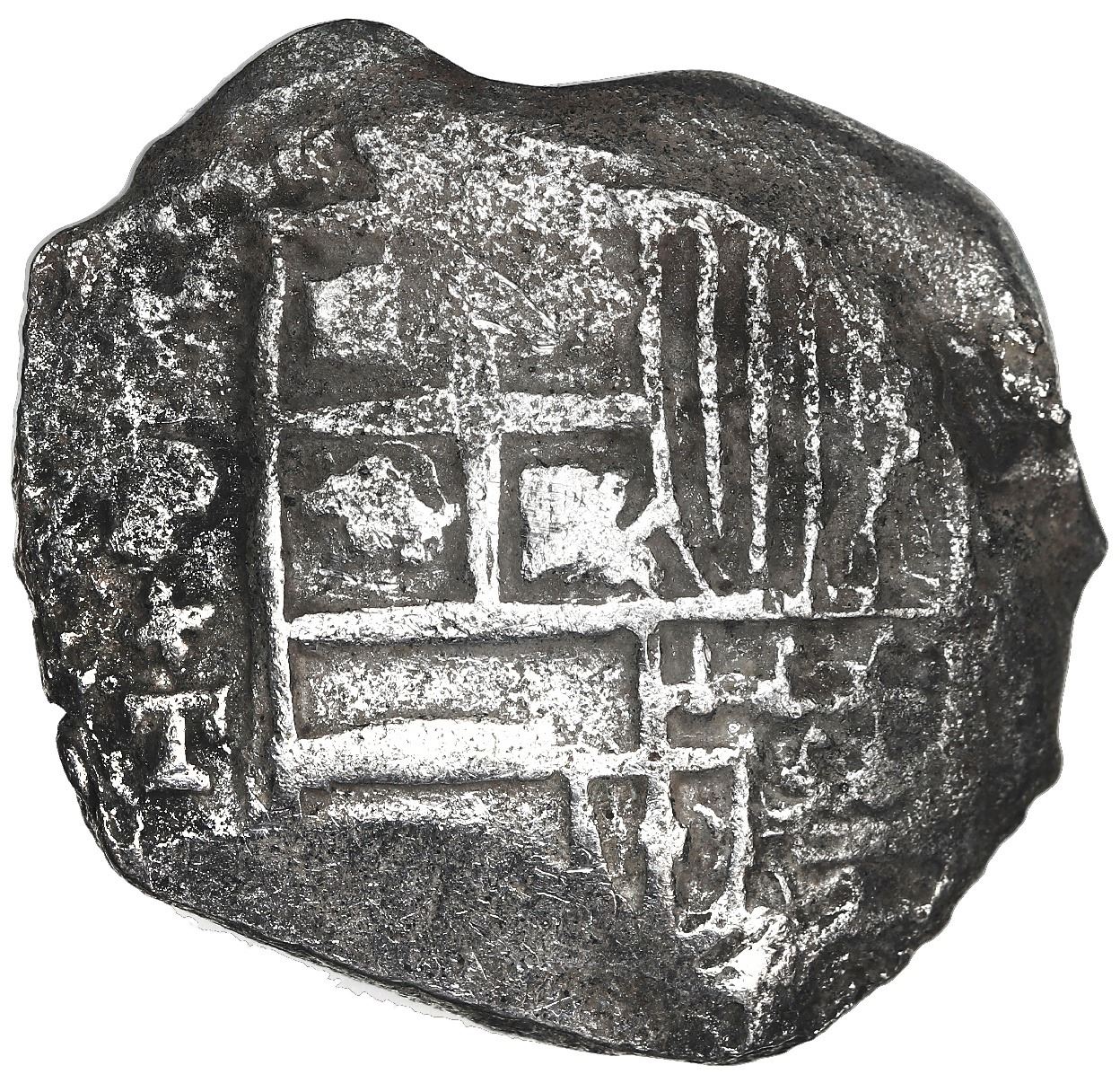 Potosi, Bolivia, cob 8 reales, Philip III, assayer T (1618-9), Grade 2. S-P21; KM-10. 18.78 grams. Bold P+T, nearly full shield, off-center cross with most of 161 of date, some patchy toning and edge-loss from corrosion. With Fisher tag and certificate 85A-130993, pedigreed to the RWB Reference Collection of Atocha dated cobs. Recovered from: Atocha, sunk in 1622 west of Key West, Florida