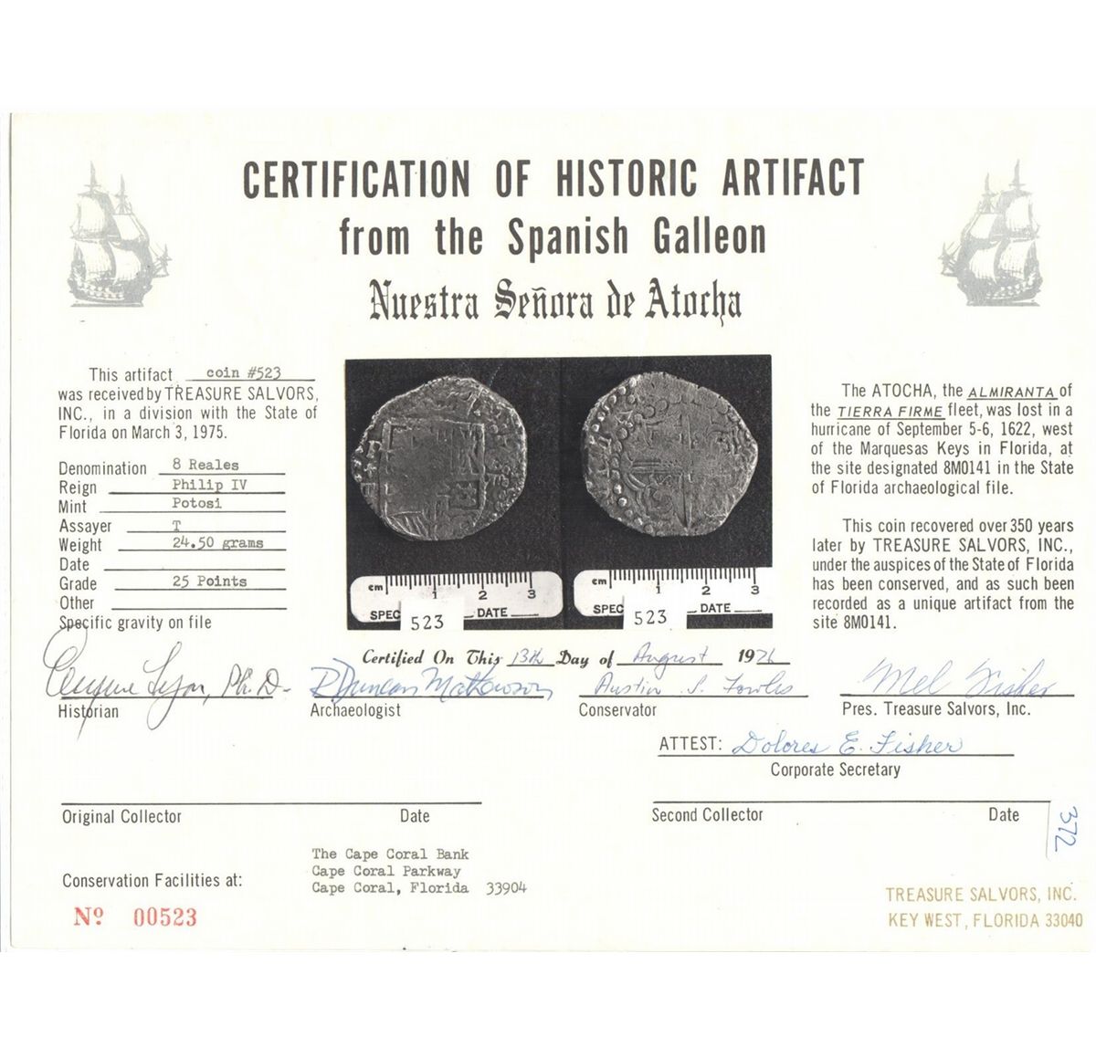 Potosi, Bolivia, cob 8 reales, Philip III, assayer T, Grade-2 quality (25 points), with early hand-signed certificate. S-P21; KM-10. 24.5 grams. Bold full P+T, full shield and denomination, full but weakly struck cross, toned, only very light surface corrosion. With photo-certificate #523, hand-signed by Mel Fisher (and others), tag missing. Recovered from: Atocha, sunk in 1622 west of Key West, Florida