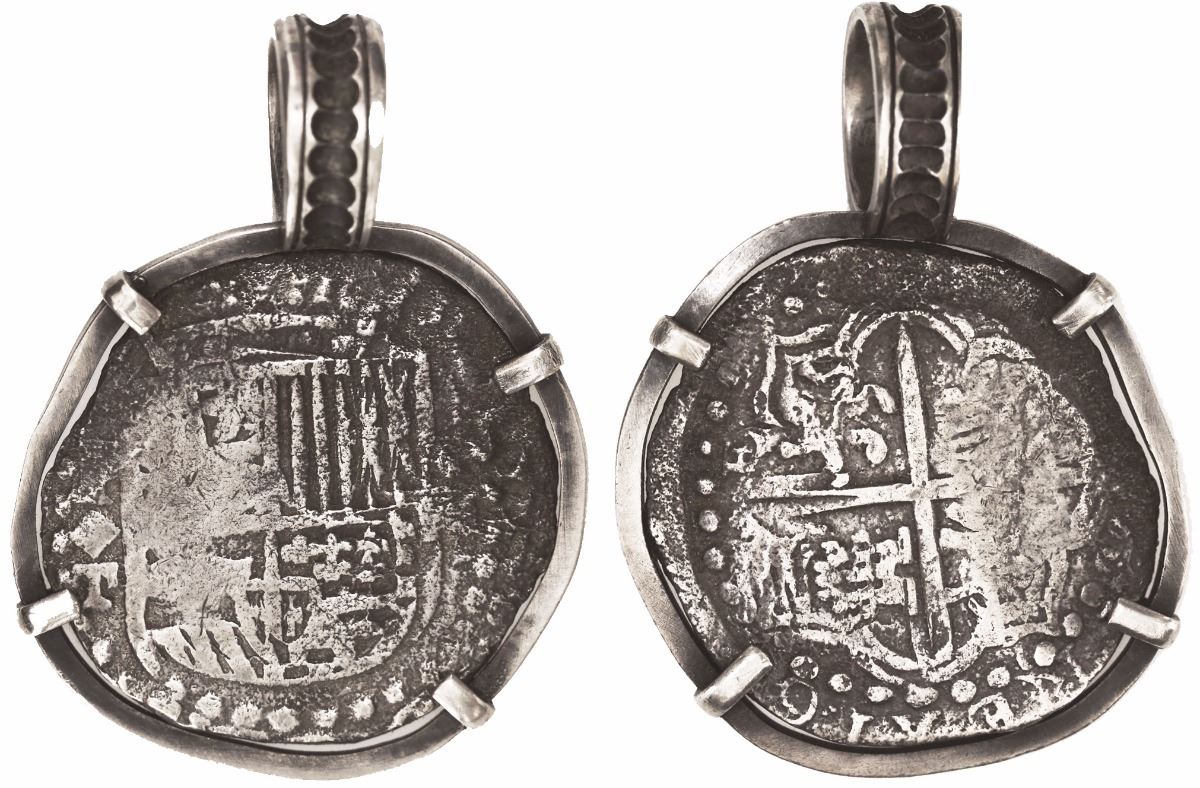 Potosi, Bolivia, cob 8 reales, Philip III, assayer T, Grade 3, mounted in silver pendant-bezel, with tag but original certificate missing. 32.58 grams total. Partial date 16(??), bold assayer, full shield and full but half flat cross, corroded just around edge, mounted shield-side out but aligned with one arm of cross and with huge bail at top. With original Fisher tag #94A-6131. Recovered from: Atocha, sunk in 1622 west of Key West, Florida