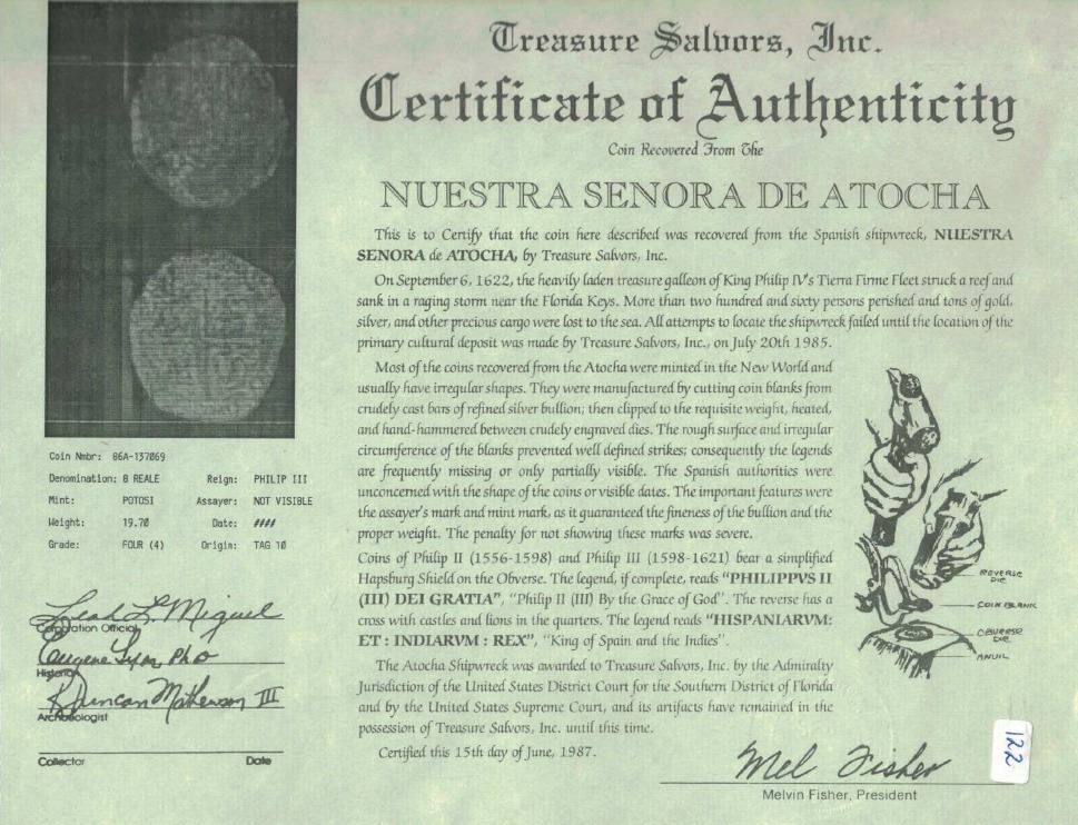 Potosi, Bolivia, cob 8 reales, Philip III, assayer T, Grade 4. S-P21; KM-10. 19.64 grams. Good full cross despite surface corrosion, the shield side more heavily corroded but still rather solid for the Grade, toned. With Fisher tag and certificate #137069, pedigreed to our Auction 19, with original lot-tag #358. Recovered from: Atocha, sunk in 1622 west of Key West, Florida