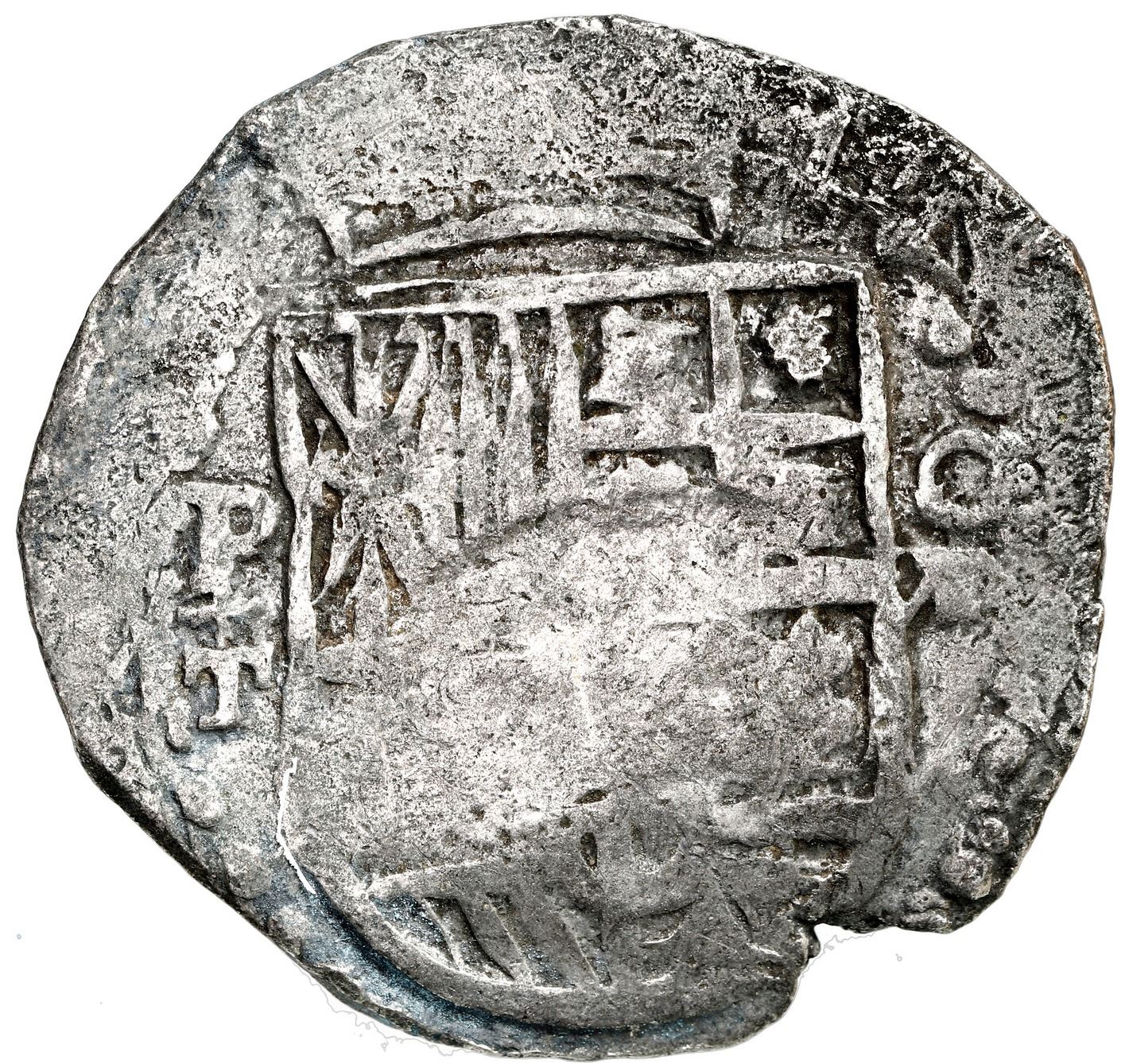 Potosi, Bolivia, cob 8 reales, Philip III, assayer T, upper half of shield transposed, Grade 2. S-P21; KM-10. 25.63 grams. Minimally corroded but flat in centers, bold full P+T, bottom of Z for penultimate digit of date in legend, toned all over. With original Fisher tag and certificate 85A-230763, pedigreed to the J.P. Silberman Estate.Recovered from: Atocha, sunk in 1622 west of Key West, Florida.