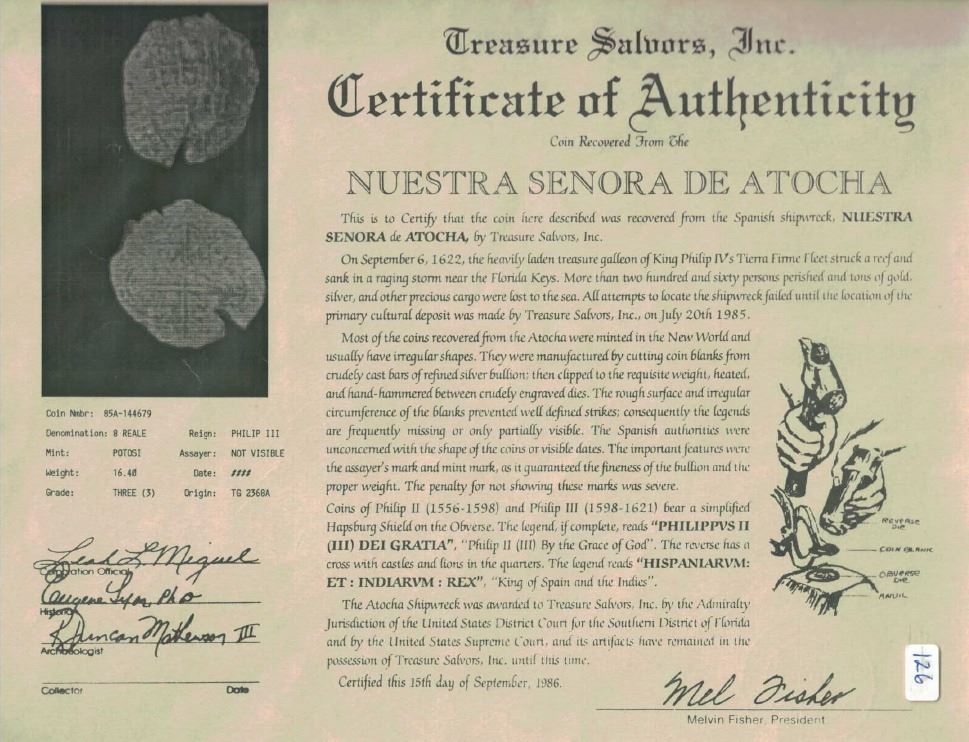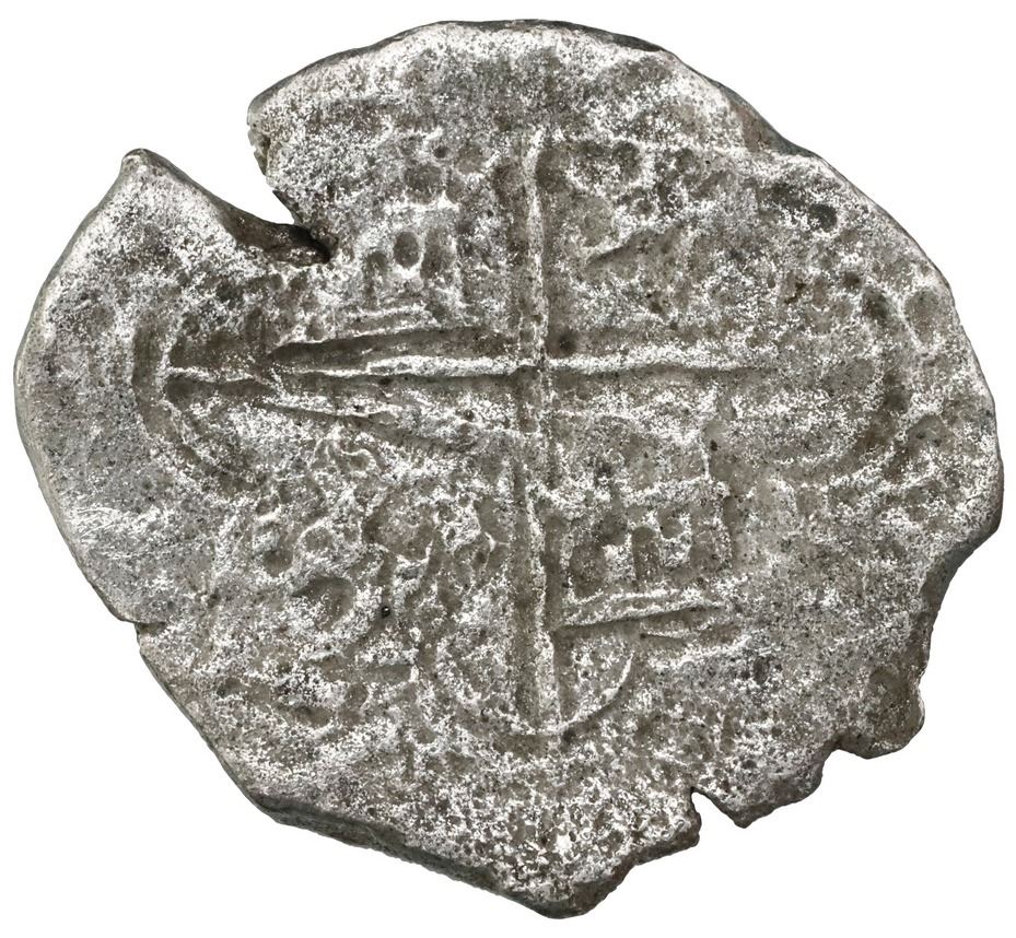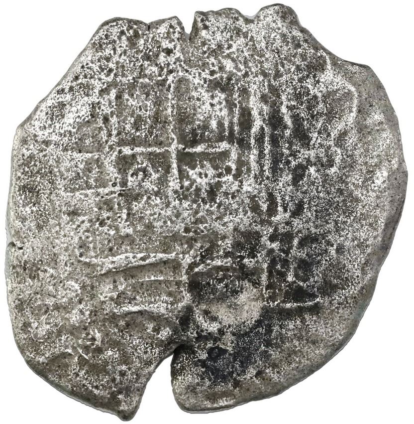 Potosi, Bolivia, cob 8 reales, Philip III, assayer not visible, Grade 3. KM-10. 16.41 grams. Full shield and cross (the latter slightly off-center), moderate surface corrosion, edge-split. With Fisher tag and certificate #144679. Recovered from: Atocha, sunk in 1622 west of Key West, Florida