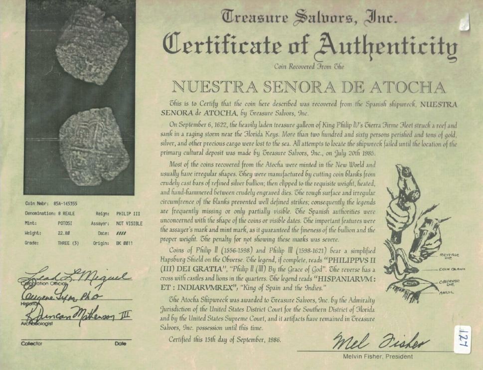 Potosi, Bolivia, cob 8 reales, Philip III, assayer not visible, Grade 3. KM-10. 22.79 grams. Broad flan with good full cross-lions-castles, full shield, moderate surface corrosion and light toning. With Fisher tag and certificate #145355. Recovered from: Atocha, sunk in 1622 west of Key West, Florida